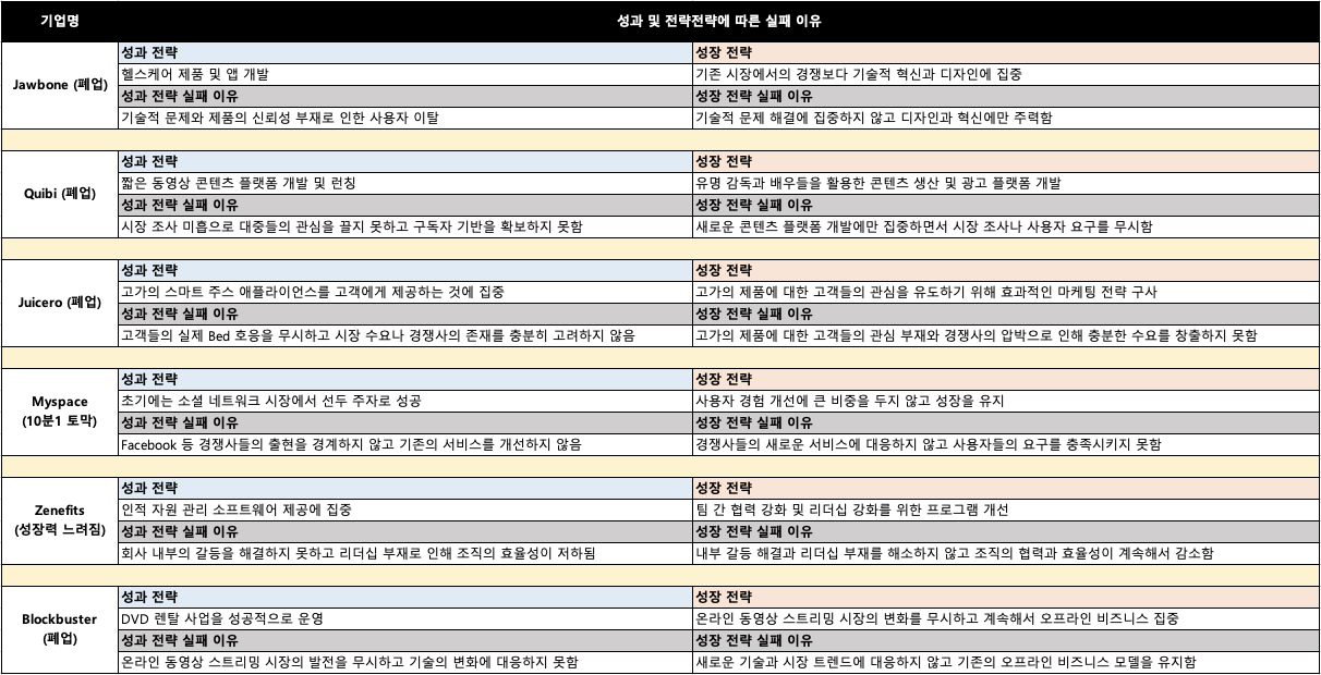 하지만 성과전략이든 성장전략이든 타이밍을 잘못 설정해 실행하면 실패할 수밖에 없습니다. 성과전략과 성장전략을 잘못 써서 실패한 기업들의 사례를 아래와 같이 정리해 봤습니다.