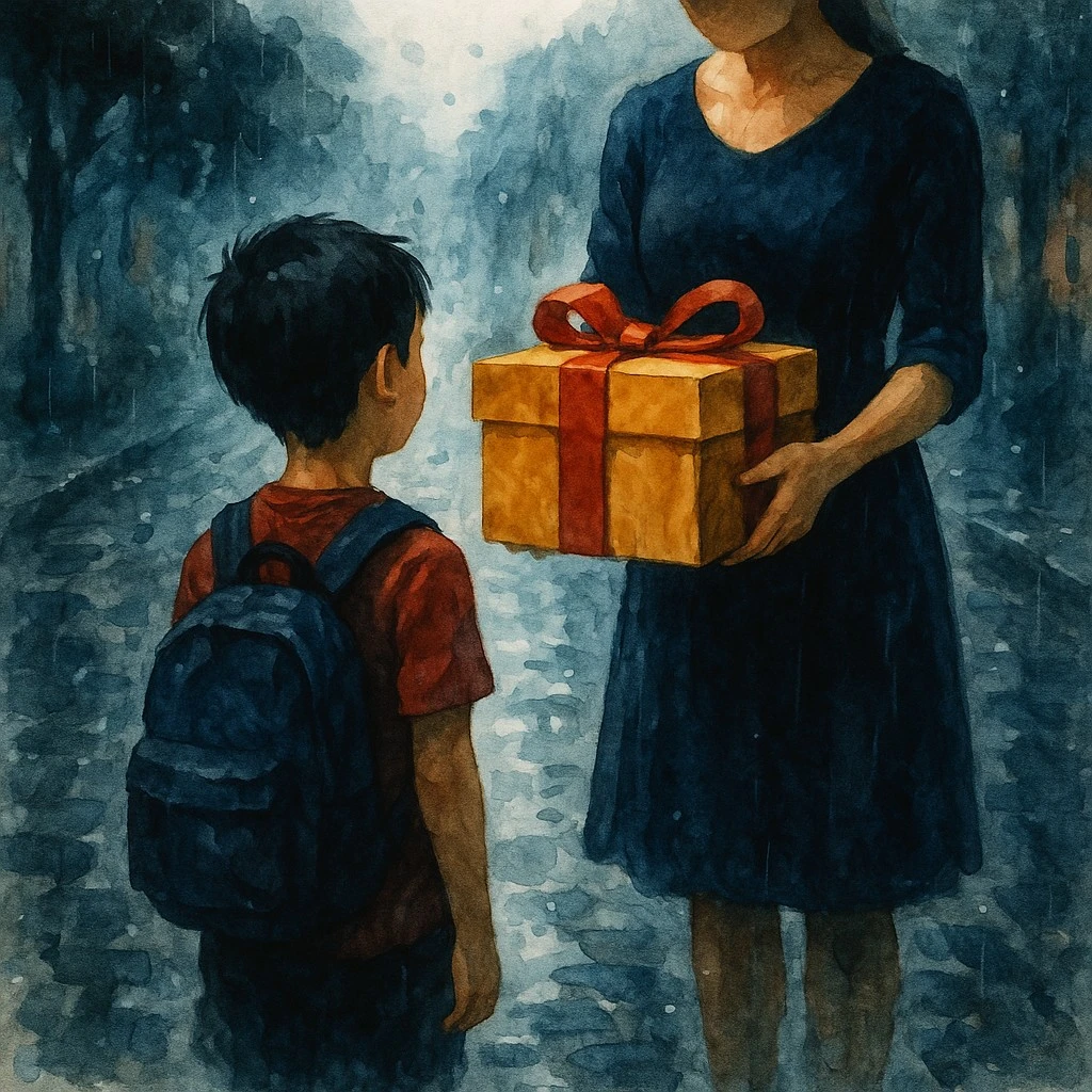 선물상자를 들고 뭉클한 표정으로 서있었다.