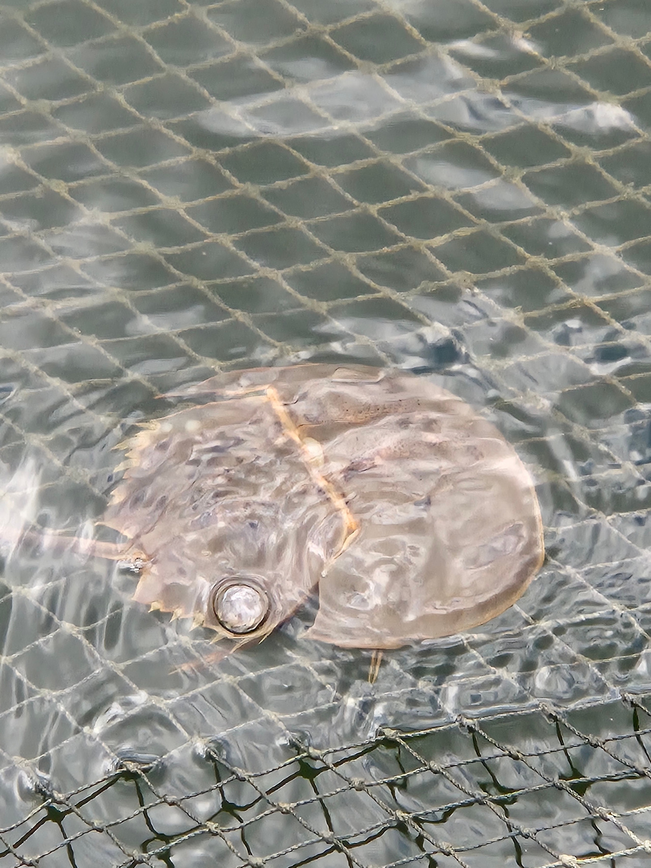 배가 잠시 양식장에 멈췄다. 홍합이 잔뜩 붙어있는 양식장에서 선장님이 갑자기 손에 무언가를 쥐어주었다. 공룡 시대에 살았을 듯싶은-사실은 공룡시대 이전부터 있었단다.-‘투구게’. ‘ 뾰족하고 긴 꼬리 같은 미추 부분을 잡았는데 워낙 딱딱해서인지 전혀 징그럽다는 느낌은 들지 않았다. 그냥 연필을 쥐고 있는 느낌이랄까. 이름은 ‘게’지만 거미나 전갈에 더 가까운 동물이고, 형태가 거의 변하지 않아 ‘살아 있는 화석’이라 불린단다.