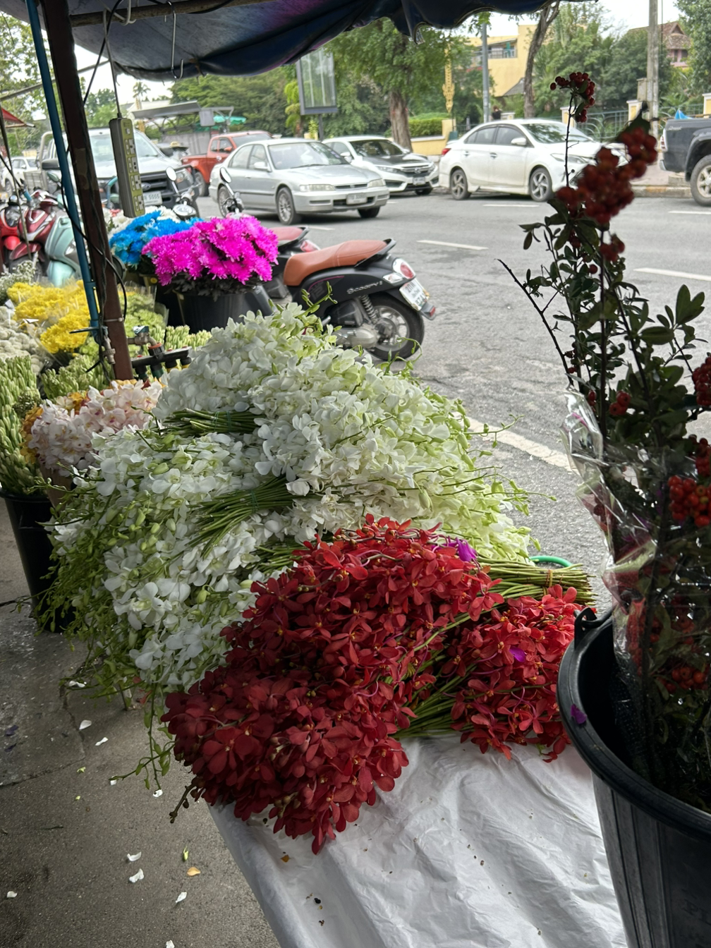 볼트로 오토바이 드라이버를 불렀다. 시장 초입에는 사람들이나 차가 많아 바글바글 거리니 오토바이가 제격이었다. 뜨거운 태양아래 따뜻한 바람을 타고 꽃시장 입구에서 하차했다. 하지만 입구부터 자연스레 인상이 쓰였다. 한 발자국을 내딛을 때마다 질퍽한 물이 쪼리 안으로 들어왔다. 게다가 꽃시장 건너편에는 누런색의 핑강이 흐르고 있어 물 비린 향이 도로에 가득했다. 꽃시장은 내가 생각한 것보다 규모가 작았고, 다라이 안에 길쭉한 꽃들이 거침없이 꽂혀있었다. 내가 생각한 것보다 더욱 쾌적하지 않았다. 아무래도 자연스레 흐르는 땀이 그 순간을 더했으리라. 도로 옆에 바로 위치한 덕분에 매캐한 매연도 덤으로 즐길 수 있었다. 바닥은 질퍽, 몸은 끈적, 제대로 정비되지 않은 인도길 덕에 절뚝이며 나는 꽃을 구경했다.