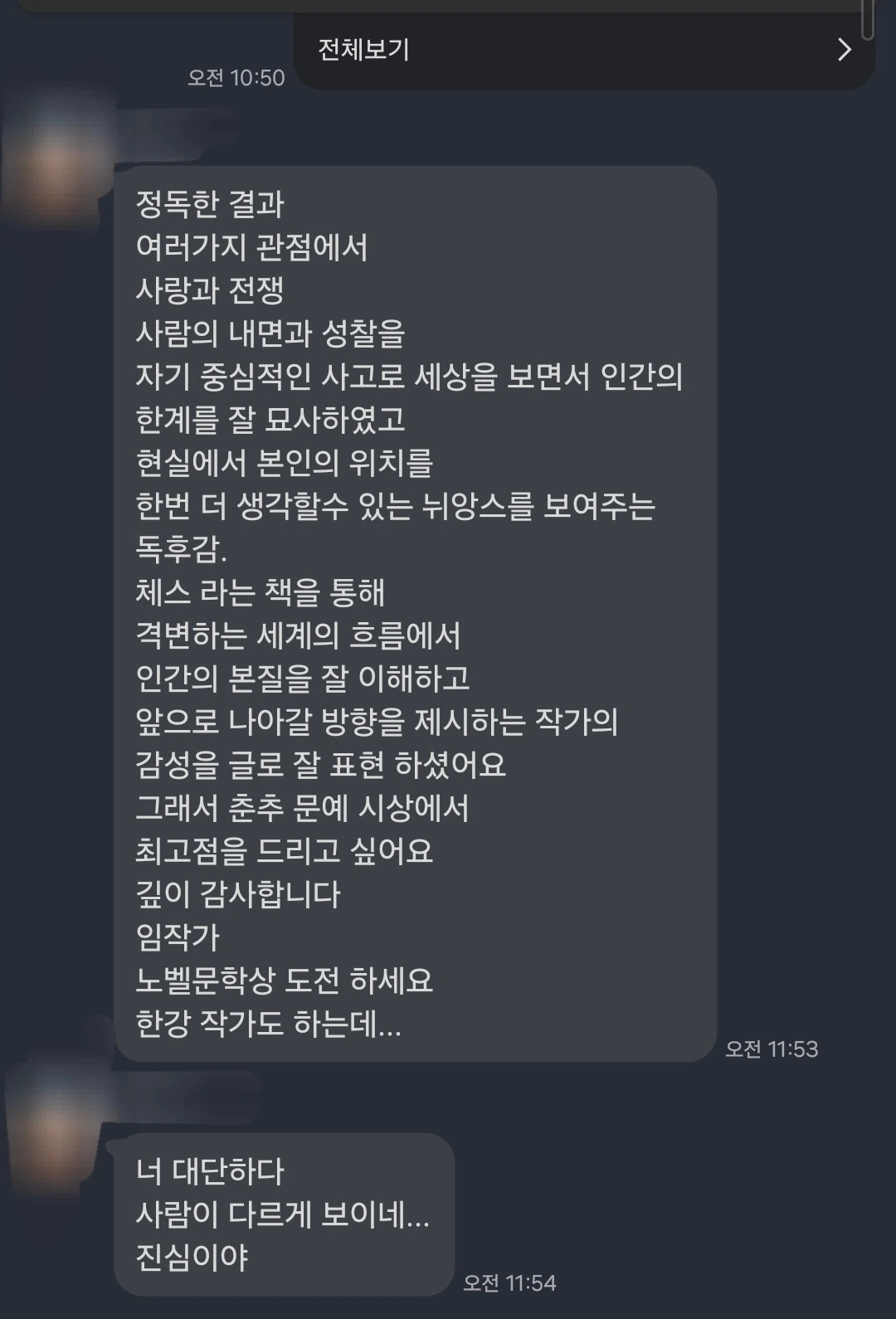 작가 : 음.. 저는 유일하게 문학이 제가 가장 잘 하는 것이라서 계속 하게 되는 것 같아요. 제 생각에 사람은 못 하는 걸 하면서 살 수는 없다고 생각해요. 노력은 잠깐이죠. 그냥 단순히 제 스스로 가장 잘하는 것이라 느끼기에 멈출 수가 없는 것 같아요.
