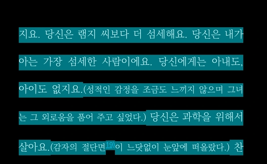 "그는 인간의 온갖 나약함과 고통 너머로 손을 쭉 뻗은채 거기 서 있었다. 그녀는 그가 관용을 품고 연민을 느끼며 인간의 궁극적인 운명을 내려다보고 있다고 생각했다."