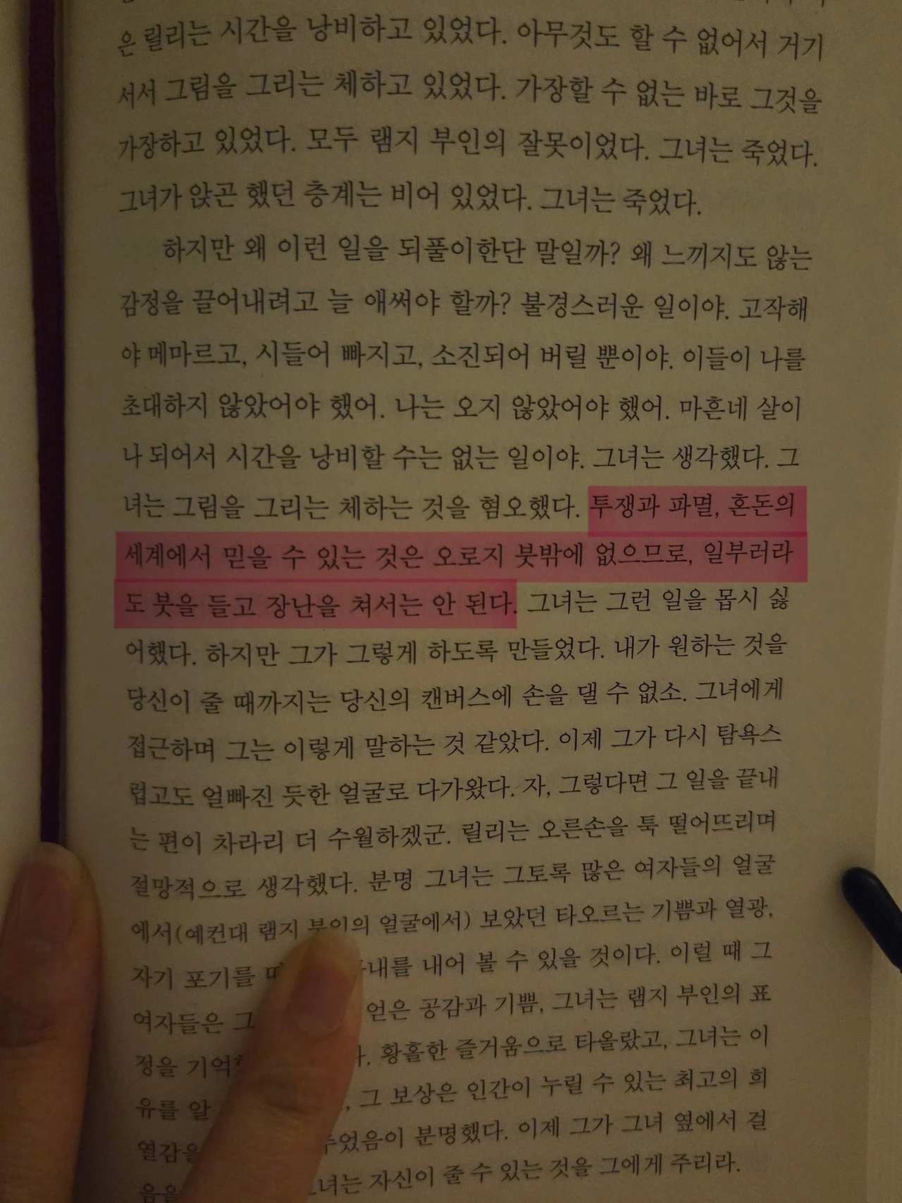 이외에도 같은 방식으로 버지니아 울프는 삶의 체면,명성,철학, 진리 ... 이 모든 것을 결국 무의미하다는 결론으로 조용히, 아름답게 지워버린다.