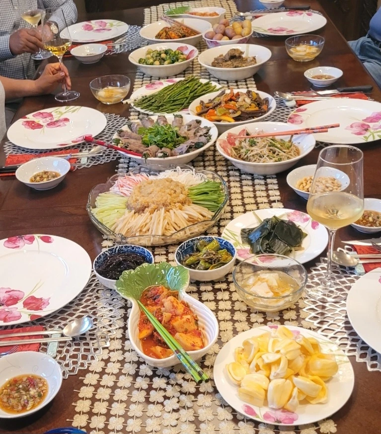이야기 속에서 이어지는 식사. 와인을 겸한 한국 음식들. 그중에는 내가 강릉에서 가져온 재료도 있고, 이곳에서 사서 준비한 것도 있다. 그 어느 것도 소홀하지 않은 내 마음을 담은 음식들이다. 다행히 친구 부부도 지인 부부도 음식을 잘 드셨고, 이야기는 끝없이 이어졌다. 밤 10시가 지나도 끝나지 않는 저녁 식사. 오랜만의 반가움이 음식을 준비한 마음과 상 위에 고스란히 내려앉았다.