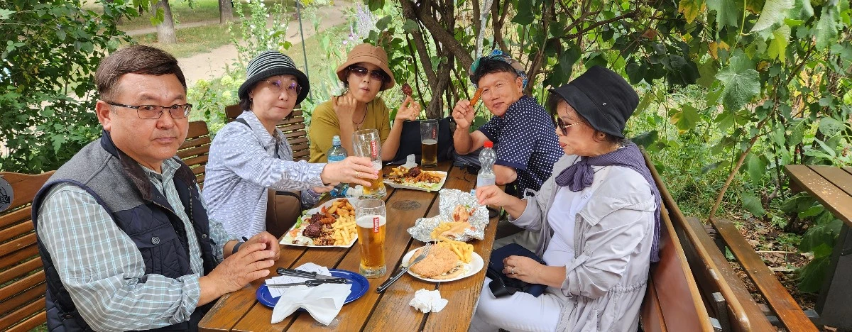 오후엔 예정대로 우리끼리 쉰브룬 궁전(Schonbrunn Palace)을 찾아가기로 한다. 미리 찾아봤던 대로 기차를 타고 한참을 가야 하고, 내려서도 좀 걷는다는 정보를 알려준다. 점심은 일단 케이크로 요기가 되었으니, 쉰브룬 궁전 근처에 가서 먹기로 한다. 광장의 한쪽에서 지하도를 내려가 기차표를 사려고 키오스크 앞에 섰다. 영어로 된 설명을 읽으며 티켓을 샀고, U4 기차를 탔고, 한참 후 쉰브룬 궁전 역에서 하차했다. 어느 쪽 출구로 나가야 할지 망설이던 중, 사람들이 모두 가는 곳을 따라 우리도 걸었다. 10여분 걷자, 거대한 성이 나타났다. 빈에 가면 꼭 봐야 할 명소답게 입구에 길게 늘어선 줄. 티켓을 구매했는데 입장 시간이 2시간 후란다. 앗차! 입장권을 미리 예매하지 않은 실책이었다. 2시간 동안 점심을 먹기로 하고 어디 적당히 앉아 먹을 수 있는 곳을 찾아 궁을 나와 시내 쪽으로 걸었다. 그러다 만난 포장마차 비슷한 곳을 찾았다. 아메리칸 핫도그에 햄버거, 소시지 등을 주문하고 빠질 수 없는 맥주도 한잔 시키고 야외 벤치같이 생긴 식탁에 자리를 잡았다. 거리의 음식을 즐겨보자며. 넝쿨 아래에서 잘 익은 청포도는 후식으로 따먹었고, 시선을 돌린 곳에선 무궁화도 만났다.