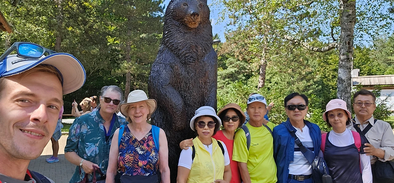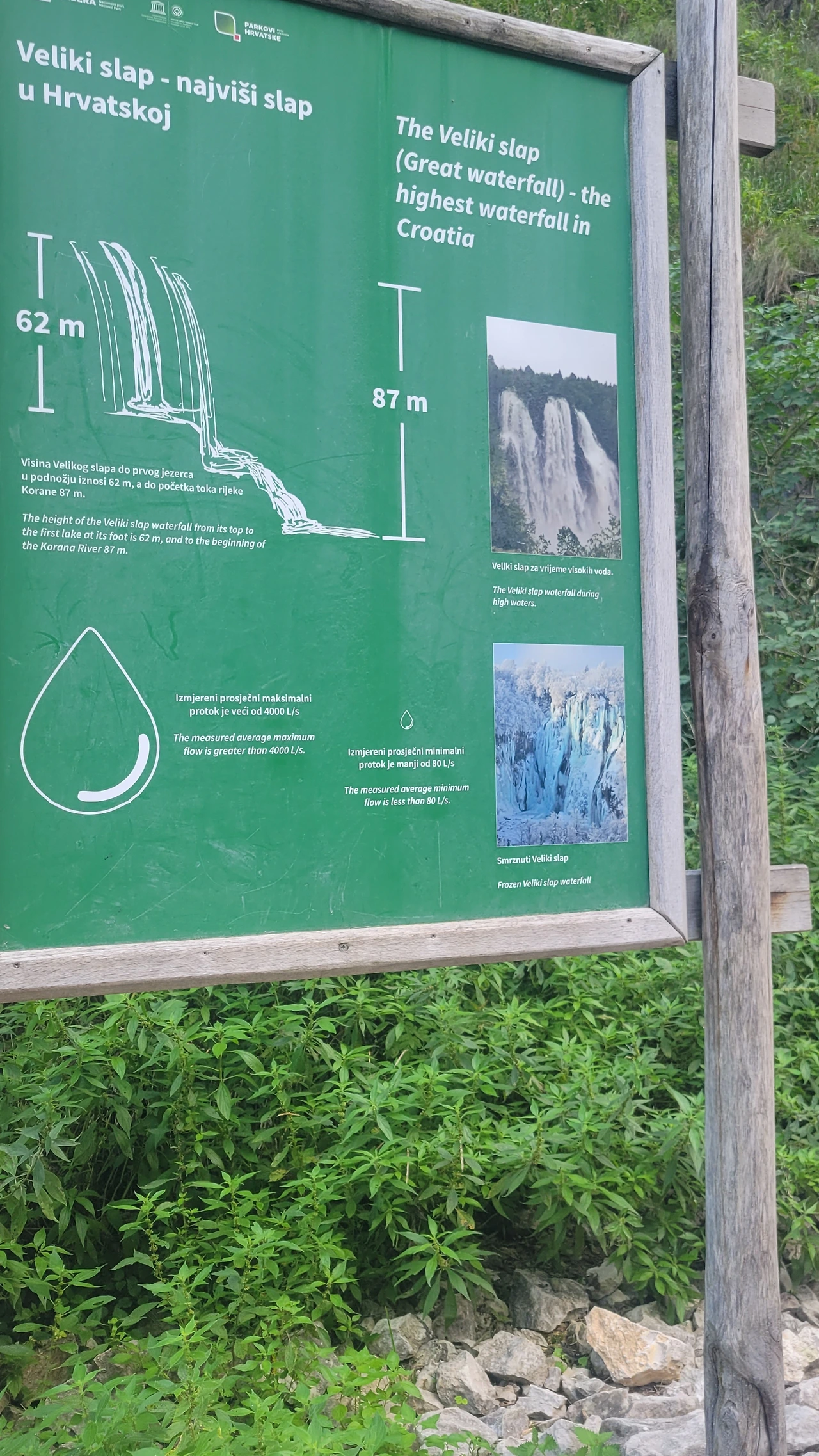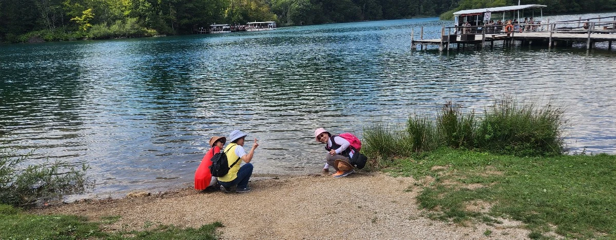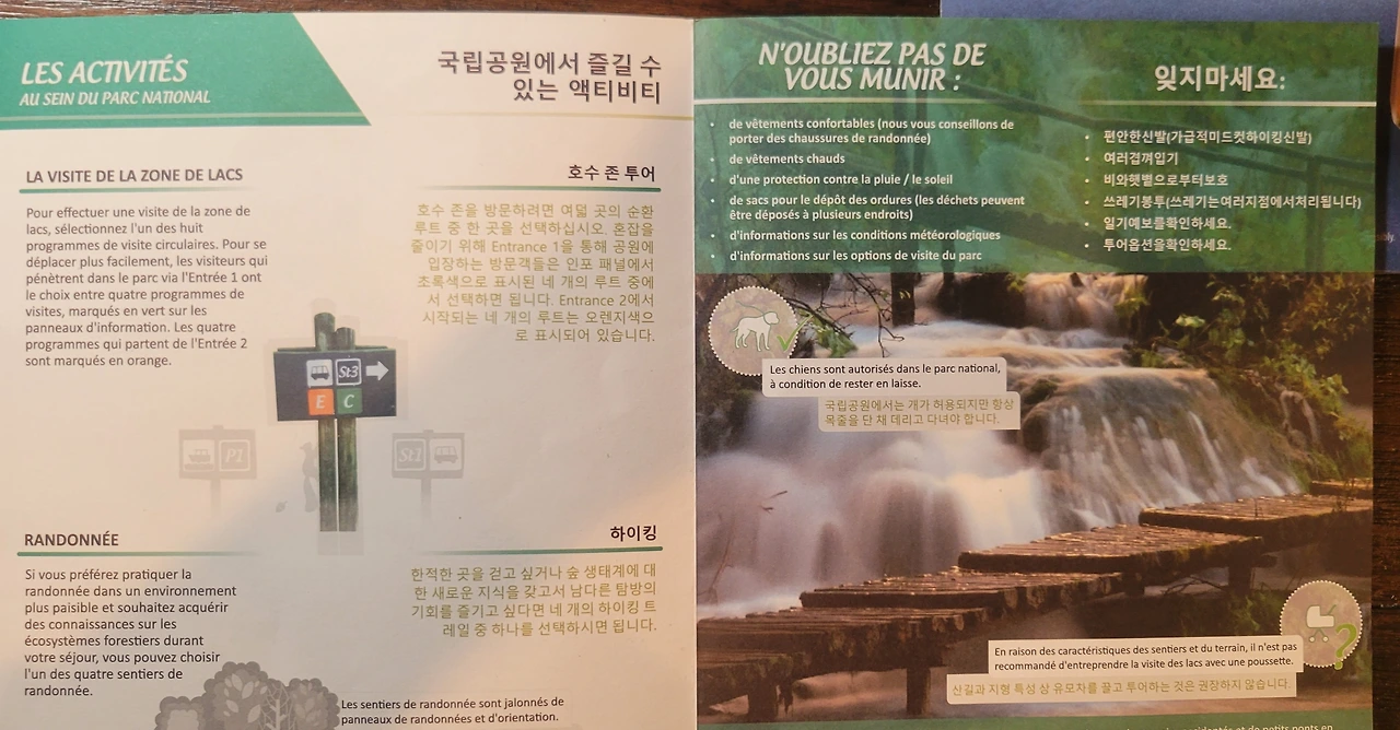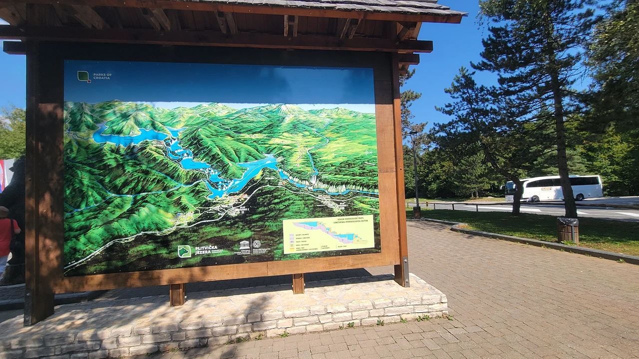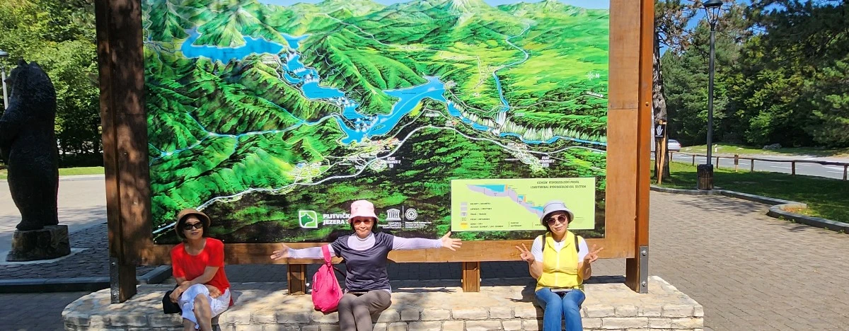 한 30분쯤 더 차로 가자 플리트비체 호수 국립공원이다. 입구는 다른 공원들처럼 기념품 가게와 매표소가 있다. 가이드가 차를 세우는 동안 우린 입구의 안내판 앞에서 인증샷 하나. 하이킹 코스가 여러 개다. 5-6시간 간다고 하니, H코스 아닐까 하며 그 둘레길을 표지판에서 살펴본다.