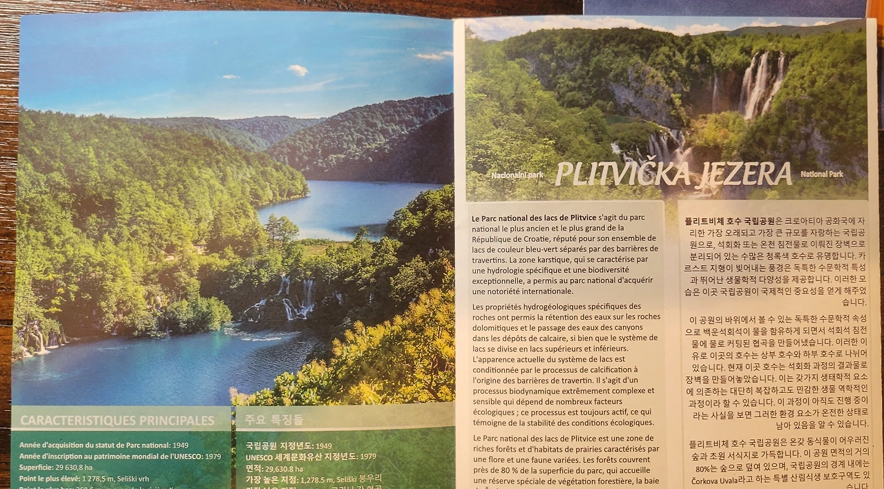 플리트비체 호수 국립공원은 여러 개의 폭포로 연결되는 16개의 호수를 가지고 있다. 약 19.5헥타르(여의도의 100배)의 면적이며, 18 Km길이의 나무로 만든 인도교는 개울과 호수 위를 낮게 지나며 상쾌한 산책로를 만든다. 공원의 크기가 광대해 구석구석을 자세히 보려면 3일 이상이 소요되지만 우린 5시간 정도의 걷는 길을 택했다. 봄 철에는 수량이 가장 풍부해 폭포의 웅장함을, 여름에는 녹음이 짙어져 숲의 푸르름 속에 갇힌 신비로운 호수의 모습을, 가을에는 사람이 적어 고요한 분위기와 어울리는 단풍의 아름다움을 느낄 수 있는 공원이란다. 겨울에는 기온이 많이 떨어져 구간 곳곳이 결빙이 되는 곳이 있어 공원의 북쪽은 동절기에는 폐쇄한다고 한다.