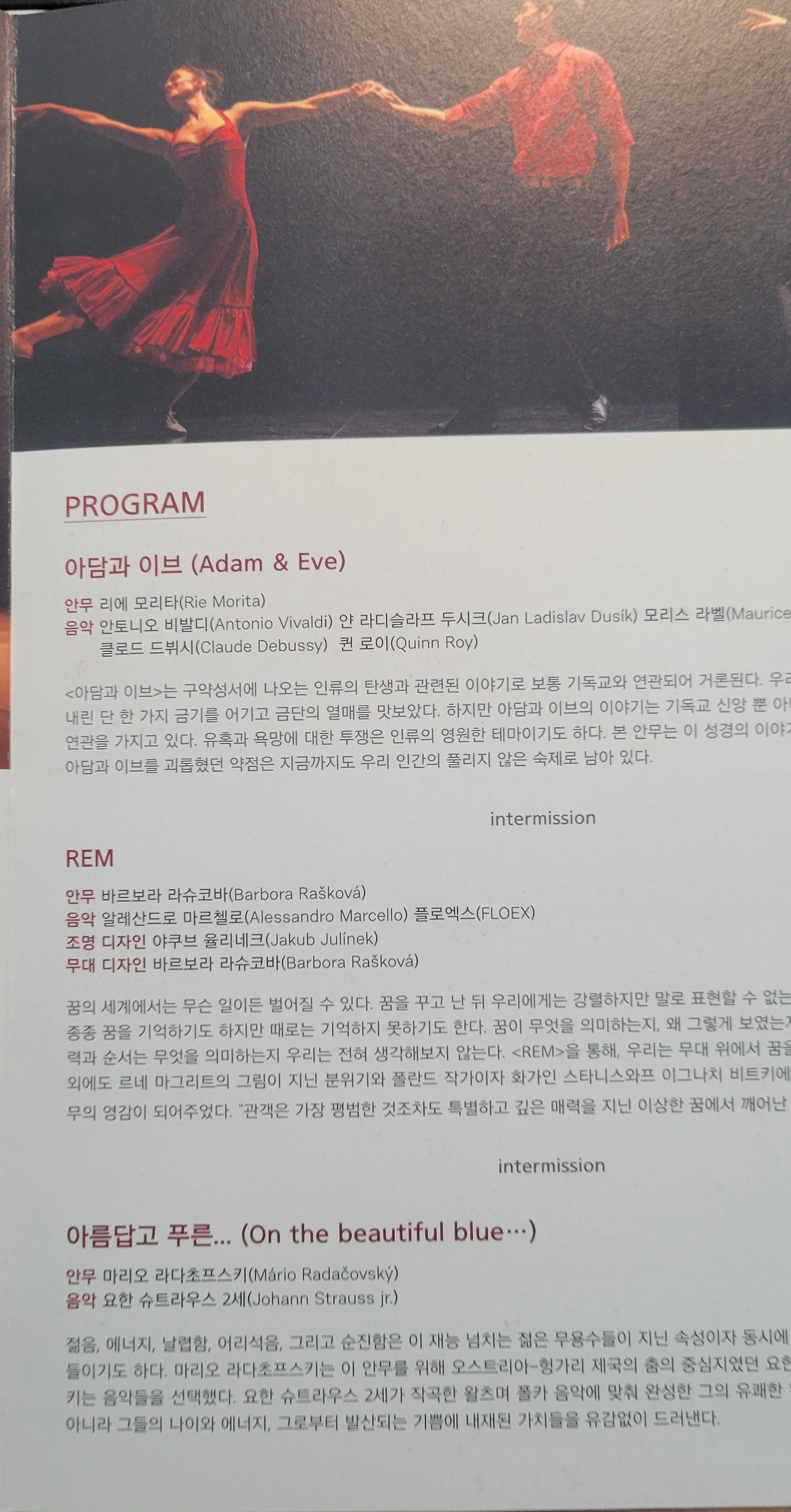프로그램에 따르면 브르노 국립 주니어 발레단(Ballet NdB2)의 역사는 그리 길지 않다. 2022년에 창단되었다. 그러나 브루노 국립발레단과 국립 극장과 긴밀히 연계되어있다. 22세 이하의 재능 있는 젊은 무용수와 체코 및 해외 무용학교 졸업생 가운데 발군의 잠재력을 가진 신인 유망주들을 선발하였다. 체코국립무용단과 활발한 콜라버레이션과 발레 마스터들의 서포트를 받고 있는 12명의 무용수들. 그들이 만들어 내는 젊음의 향연에 함께 했던 시간. 젊음의 기를 한껏 받는다.