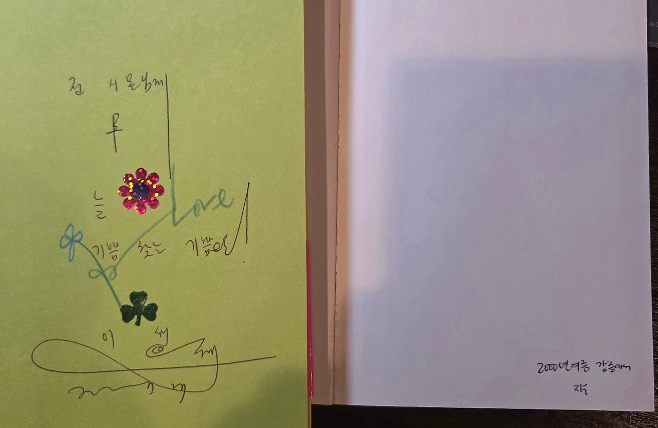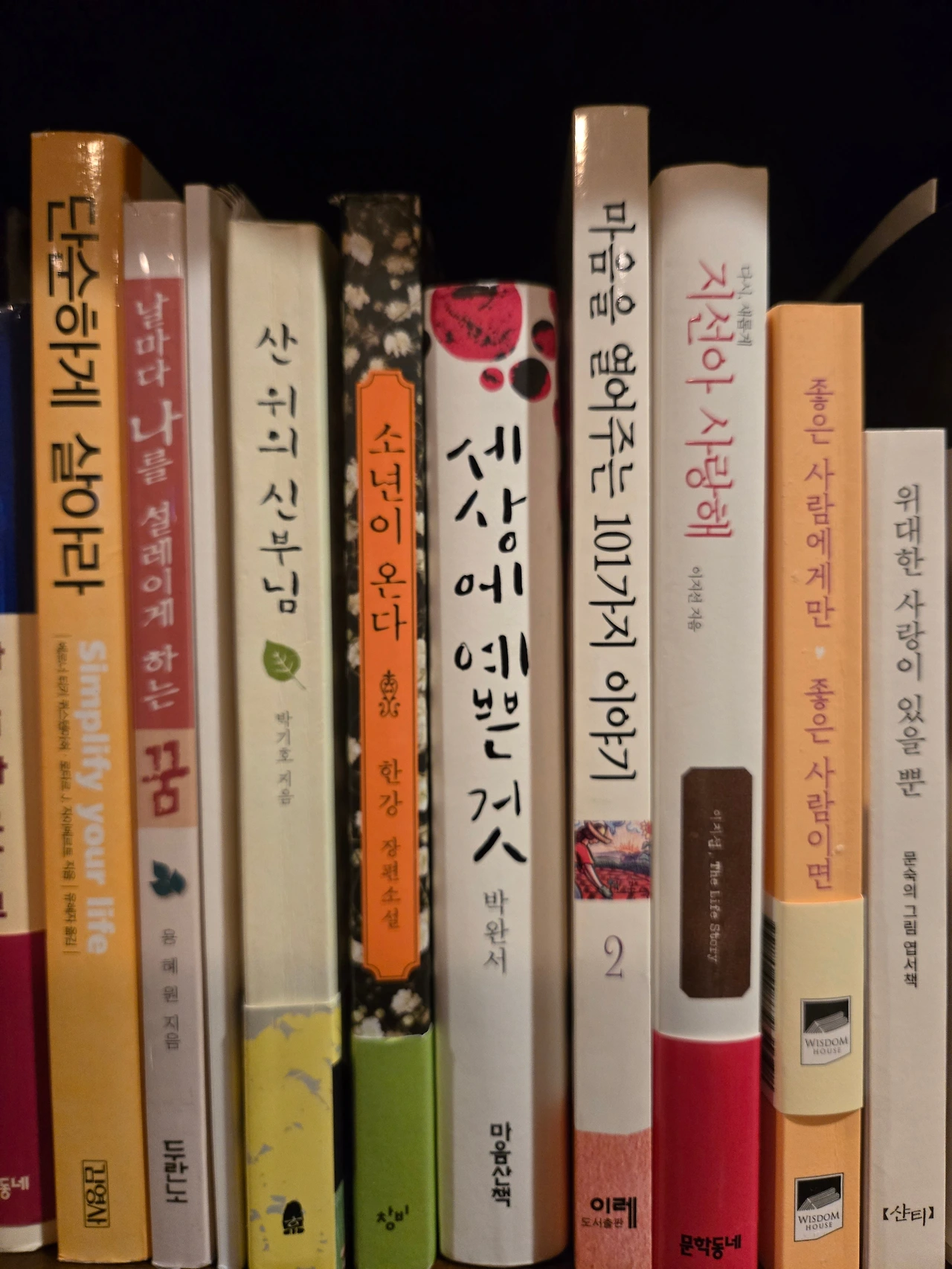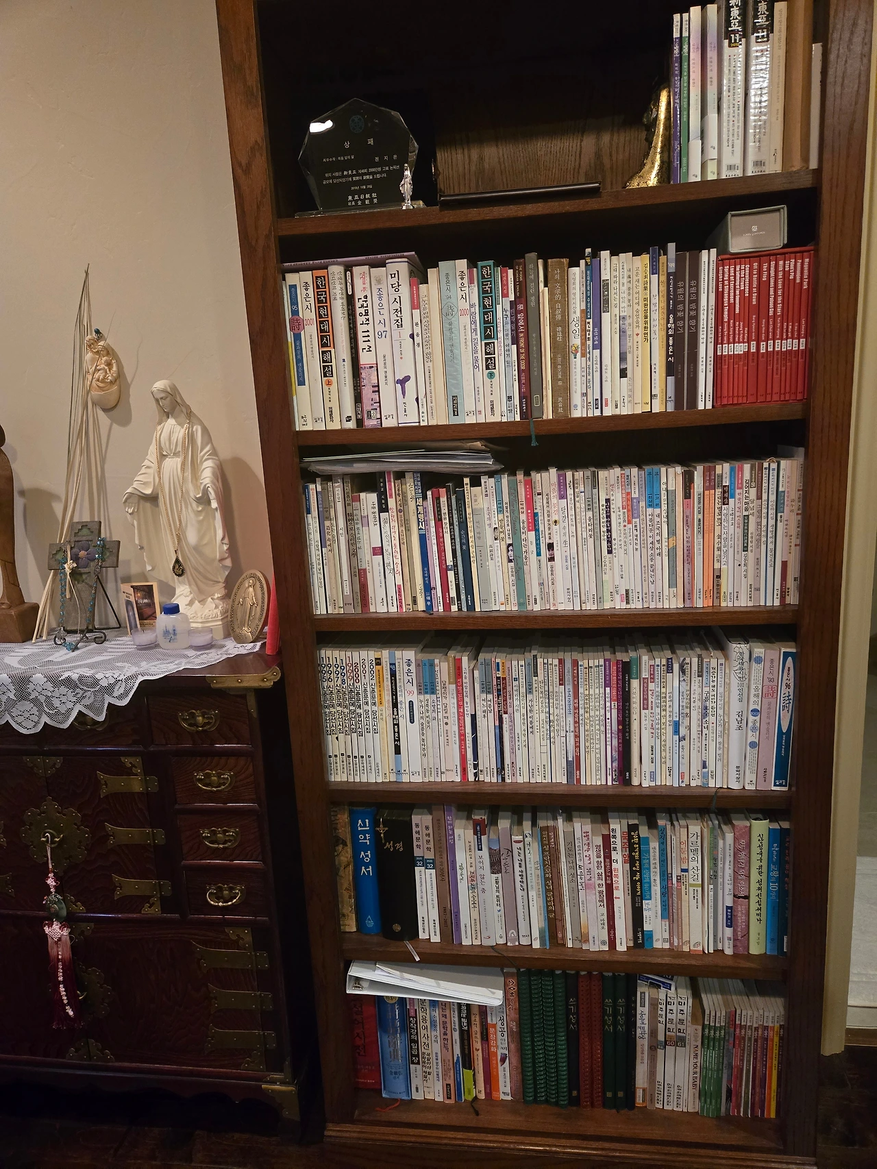 책장이 눈에 들어왔다. 이사를 와 다시 책을 정리하며 시집은 따로 모아 두었지만 수필과 소설은 뒤섞여 있었다. 분리를 해야지 쉽게 볼 수 있을 텐데 차일피일 미루었다. 그러다 오늘, 이왕 정리 정돈을 시작했고, 좀 진득하게 미국에 있을 거면 예전 책들도 다시 읽어야 할 것 같다. 소설과 수필집을 분리했다. 언제 샀더라, 언제 읽었더라, 책장을 넘겨 보기도 하고. 옛 기억을 더듬는다. 책장의 첫 페이지에는 언제, 어디서 샀는지 적혀 있기도 하다. 어느 날 내 기억이 희미해지는 시간이 오더라도 그 책장을 들추어 보며, 아~ 그땐 그랬구나, 할 수 있게. 선물로 받은 책도 있고 저자 싸인이 있는 책도 있다. 문학 강연과 피정에서 만났던 인연. 그분들은 나를 기억하지 못하겠지만 나는 그 시간을 기억한다. 어디서 어떻게 만났었고 그땐 무얼 열망했었는지.
