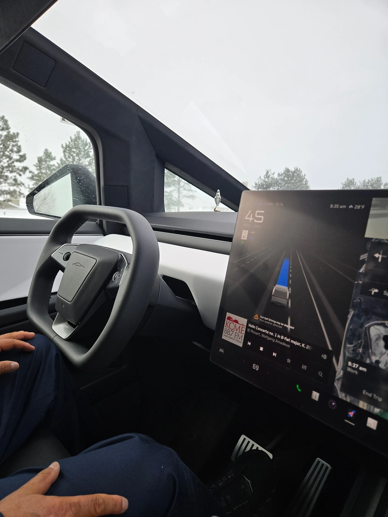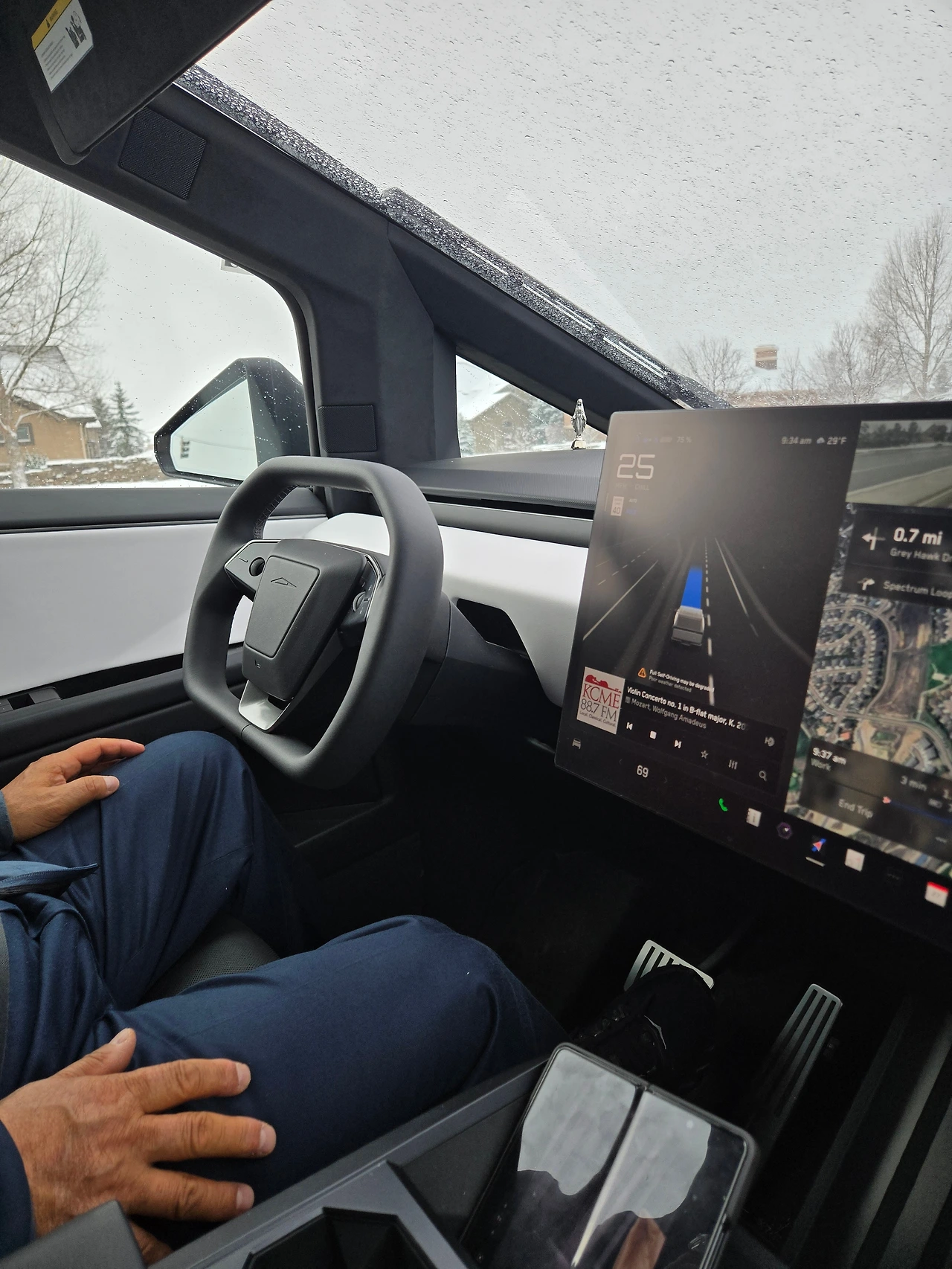 집에서 가게까지의 거리는 차로 5분 정도의 거리. 어느 날부터 남편은 그가 애정하는 싸이버트럭의 자율 주행 기능을 쓰고 있다. 차는 제법 똑똑하게 알아서 간다. 정확히 주행속도를 지키고 스스로 깜빡이를 커며 좌, 우측 회전을 한다. 신호등 앞에서도 정확히 선다. 지나가는 차들과의 간격도 정확히 지킨다. 화면에는 푸른 등으로 주행방향을 알려 주고 모니터는 가는 길을 정확히 표시해 준다. 운전을 하는 남편의 손은 얌전히 무릎 위에 올라가 있다. 늘 옆자리에 타는 나만 조마조마.