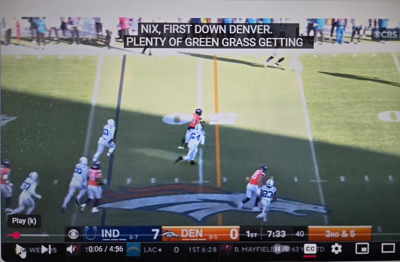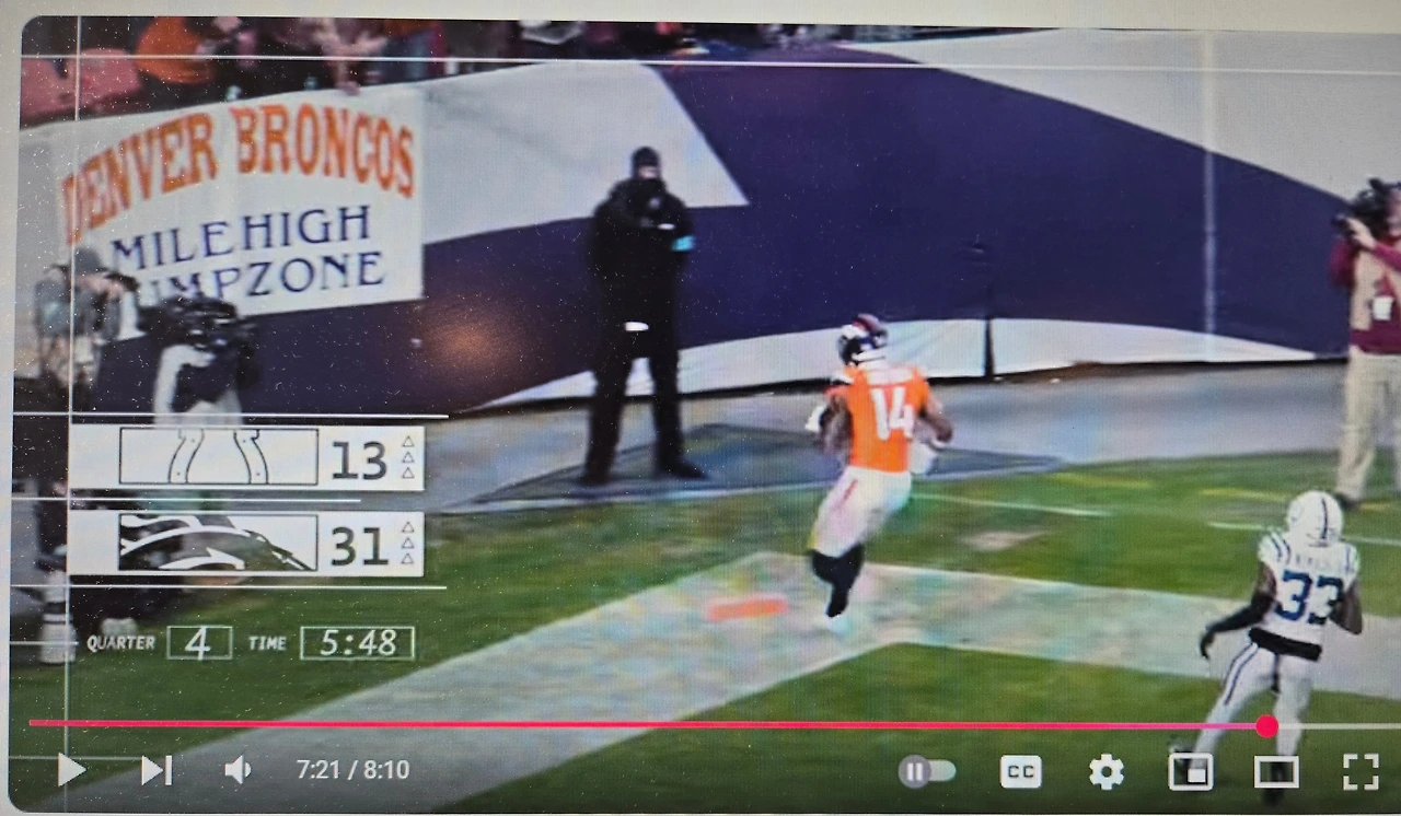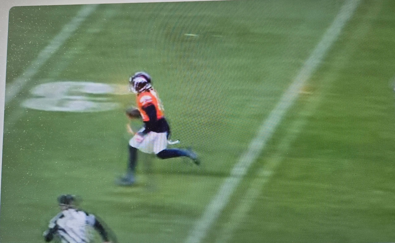 첫 쿼터 5분 만에 선제 점, 터치 다운을 내 준 브롱코스. 공은 우리 팀으로 넘어오고 꽤 전진을 하는가 싶더니, 엔드 존 근처 20 야드에서 공을 인터셉(intercept)을 당하고 만다.이겼다는 걸 알고 보는 게임이지만 ‘아이고~’하는 탄식이 절로 나온다. 아무리 기량이 좋은 쿼터 백이라고 하나, 보 닉스(Bo Nix)는 신생이고, 아직 경험이 부족하다는 걸 여실이 증명하는 실수. 얼굴이 클로즈업되며 아쉬운 표정이 잡힌다. 20대 중반인 그에게는 성장할 일 만 남았다. 경험과 노력을 통해서 얼마든지 발전할 수 있는 역량이 충분하다는 해설자의 설명. 그렇겠지, 라며 동의했지만 2 쿼터에서는 쌕(Sack: 공을 던지려는 쿼터백을 상대방 수비수가 태클을 걸어 넘어지며 공격이 종료되는 것)까지 당했다. ‘저걸 어쩌지?’ 아쉽게도 게임은 끌려가고 있었다.