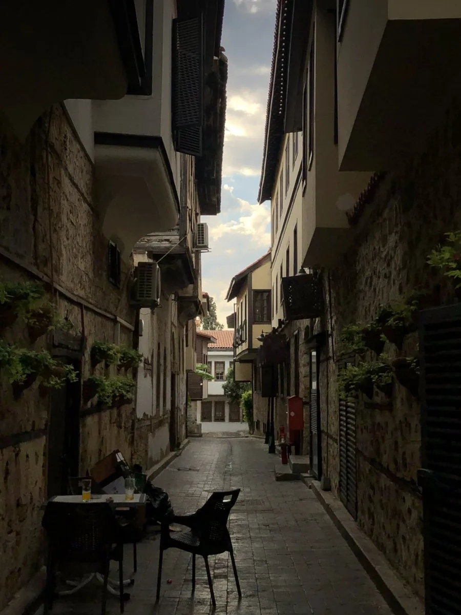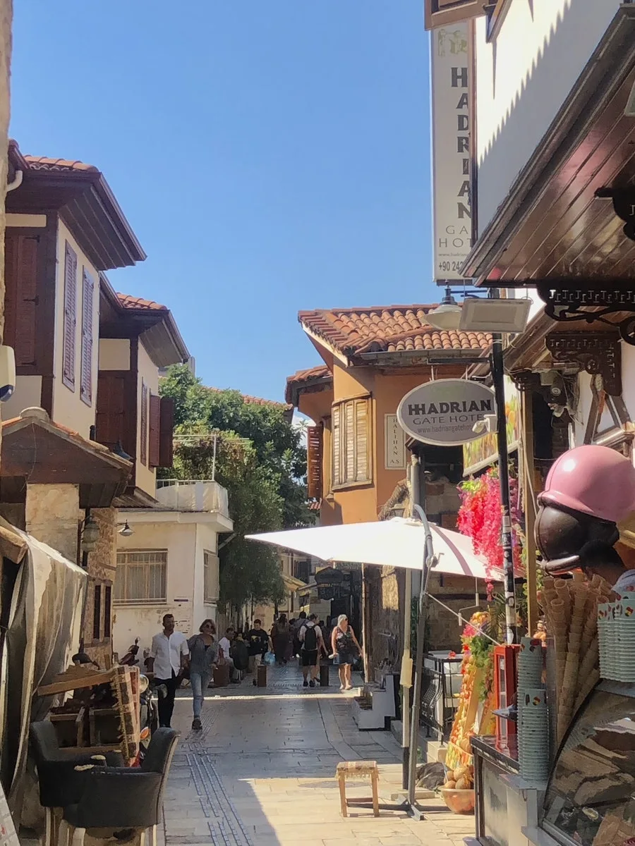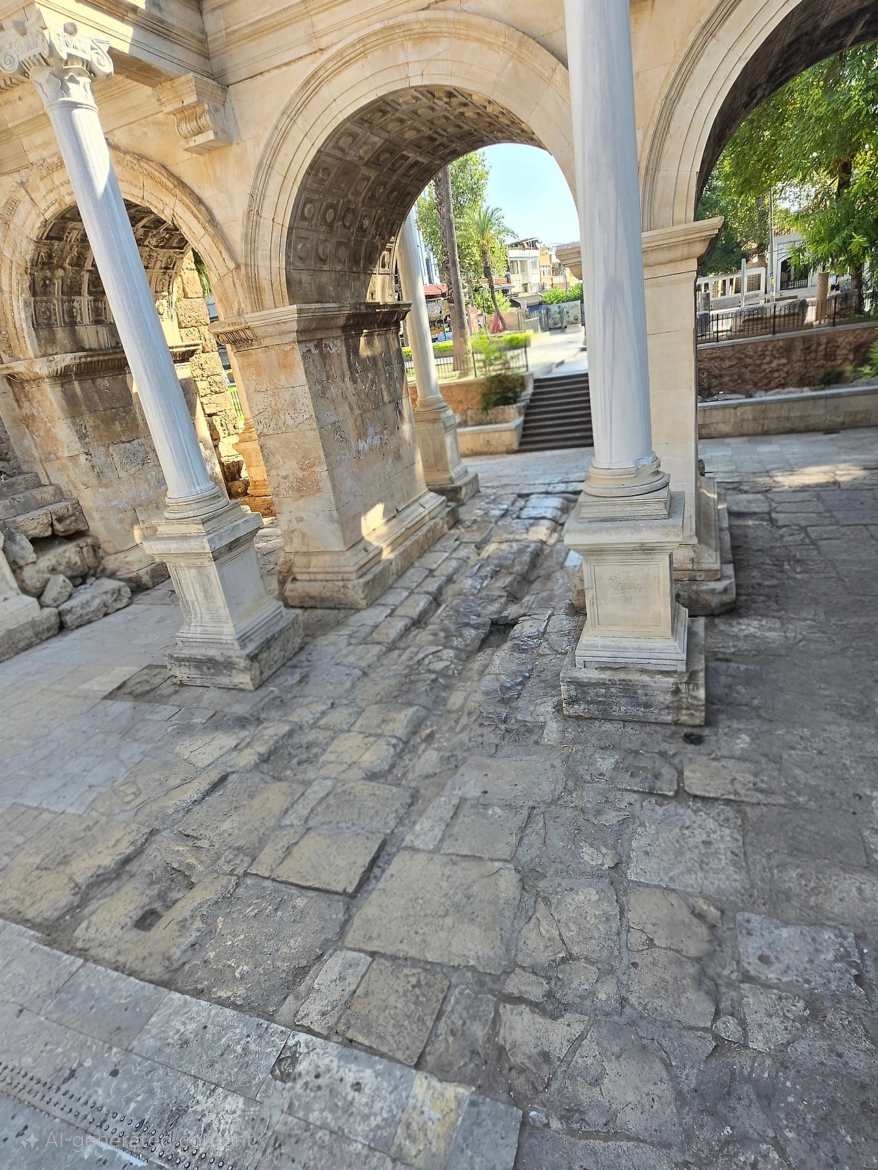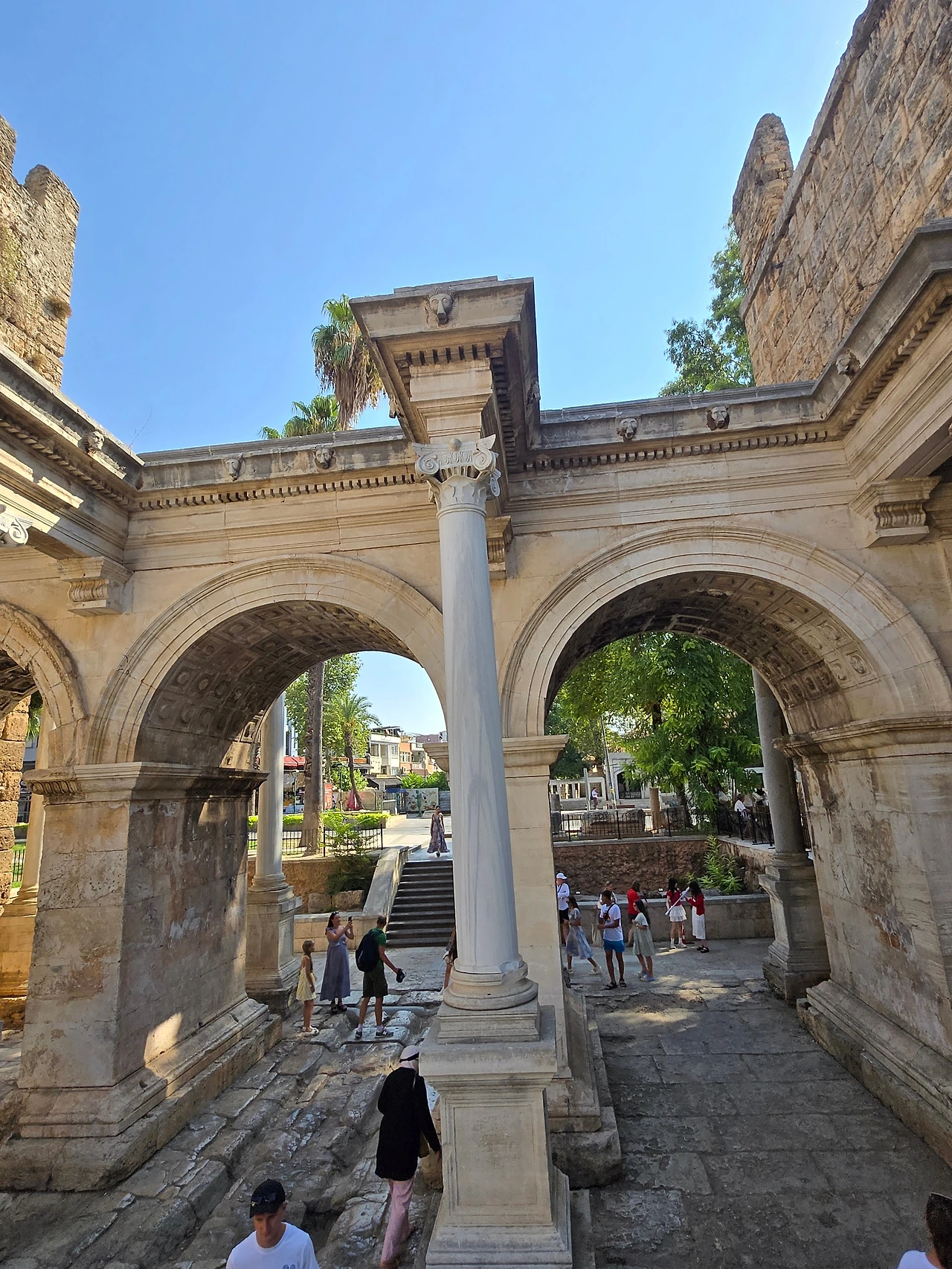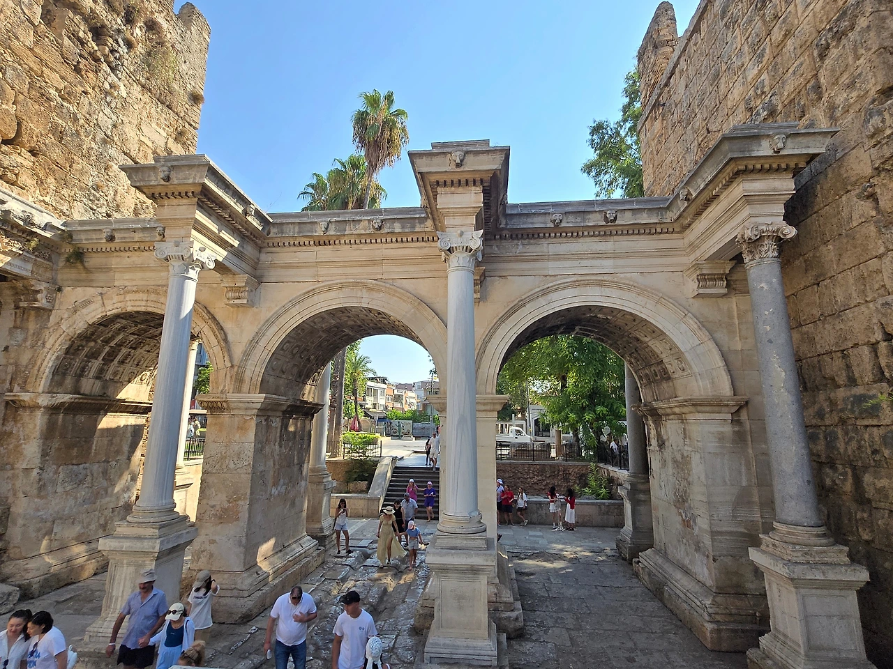 걸어서 일정을 시작한다. 숙소에서 나와 길을 건너면 작은 광장이 있고, 그 앞이 지중해로 해가 지는 노을의 명소. 일몰 시간을 확인하며 걸어간다. 첫 방문지는 하드리안 문(Hadrian’s Gate), 로마 황제 하드리아누스 방문을 기념해 세워진 웅장한 석조문으로 안탈리아 구 시가지의 상징적인 유적이다. 2천 년의 역사를 그대로 간직하고 있는 곳. 이 문을 통과해야 구 시가지로 갈 수 있다. 옛 건축이라 바닥은 대리석이고, 미끄럽다. 구 시가지는 미로처럼 얽혀 있지만 예쁘게 잘 꾸며져 있다. 기웃거리게 만드는 선물 가게들. 좁은 골목들. 이른 시간인데도 여행객들이 많다. 가이드가 갑자기 질문을 던진다. ‘저 집의 이층이 좀 튀어나왔잖아요? 왜 그렇게 지었을까요?’ 당시의 건축 양식이 그랬다. 통풍이 잘되게 하기 위해 그랬다. 공간을 좀 넓이기 위해 그랬다 등등의 답이 나왔지만 모두 땡~ 그때 누군가가 ‘세금 때문에’라고 답한다. 딩동댕~ 건축물 전체에 대한 세금이 아니라, 건축물이 골목의 땅과 만나는 면적으로만 세금을 매겼기에 세금을 줄이기 위한 방법으로 땅과 다은 일층은 적게 짓고 위층은 더 내어서 지었단다. 옛날이나 지금이나 사람들은 누구나 세금을 더 많이 내기를 싫어 하나보다, 하며 웃는다. 사진 몇 장 찍으며 자리를 이동한다.
