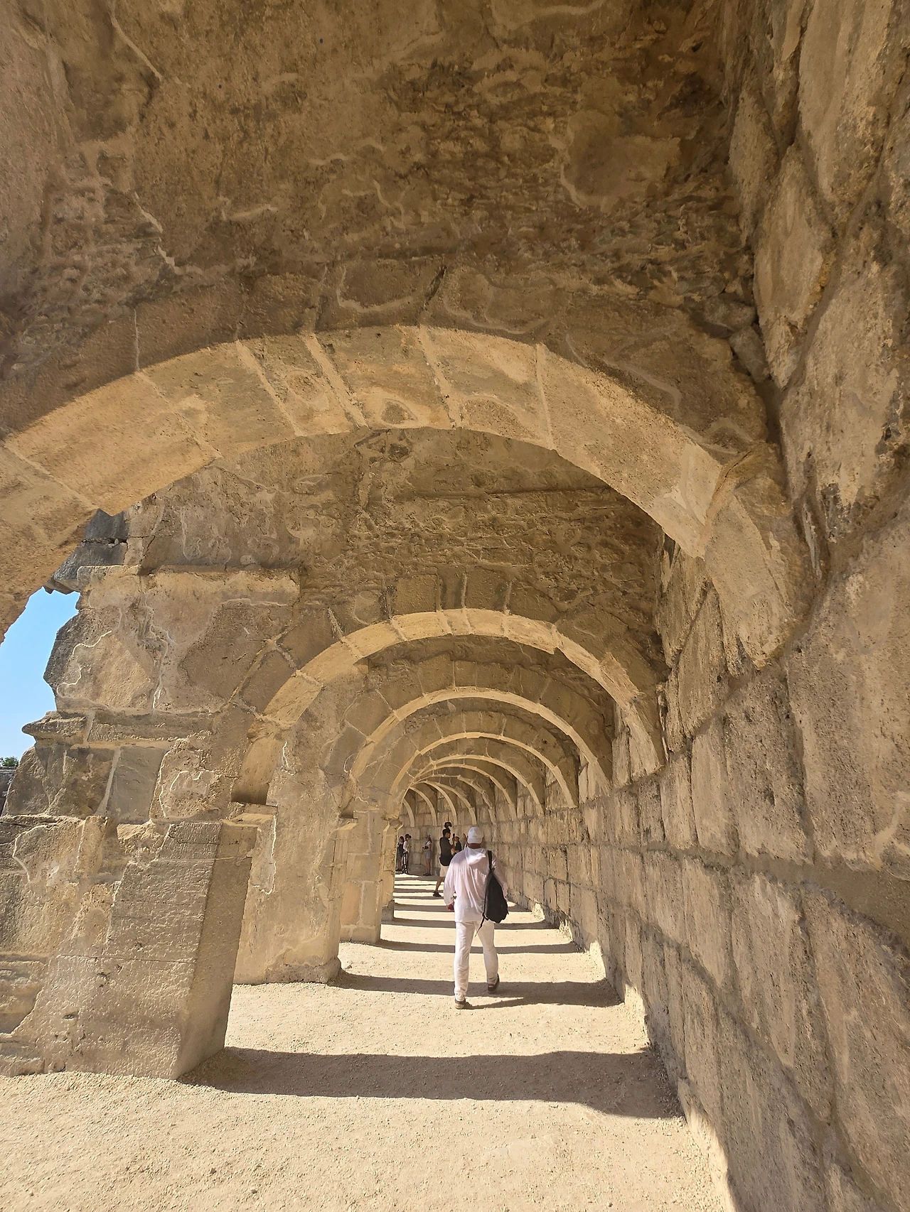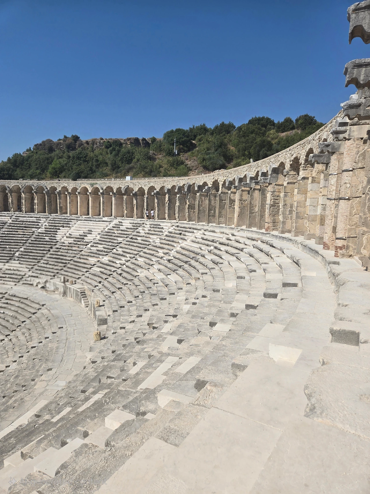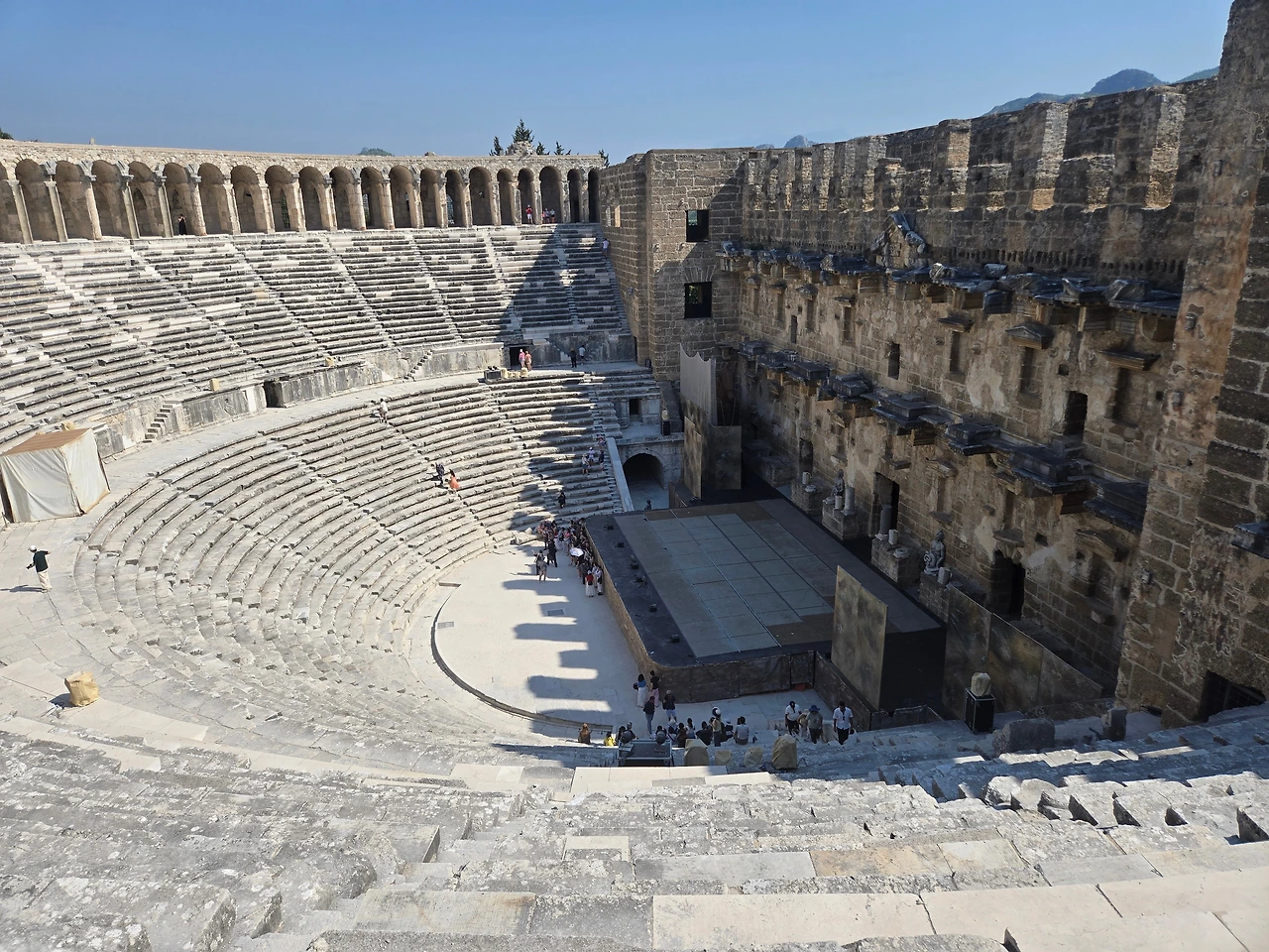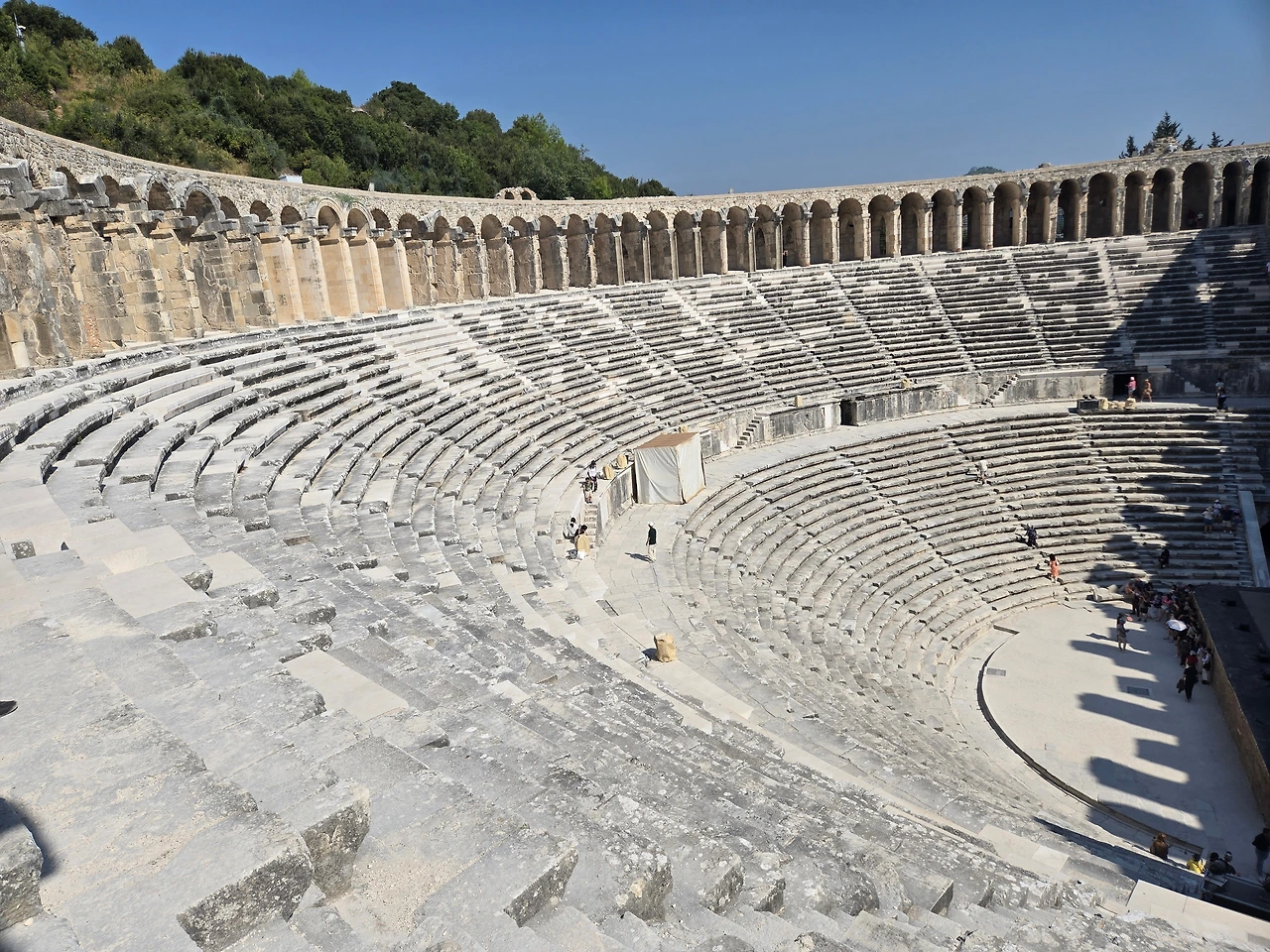 식사를 마치고 그야말로 허허벌판, 한참을 달려 도착한 곳은 아스펜도스 원형극장(Aspendos Theater). 가는 곳마다 보았던 어느 원형 극장보다 크고 보존이 가장 잘 되어 있다. 어디서 찍어도 인생샷이 될 만큼 근사한 곳. 튀르키예에 남아 있는 원형 극장 중 가장 오래되었단다. 이 극장은 마이크 같은 현대 음향 시설이 없이도 무대의 목소리가 객석 끝까지 골고루 전달되는 독보적인 음향 구조로 되어 있단다. 세계의 성악가들이 가장 선호하는 무대 중 하나. 무대에서 노래를 부르면 소리의 울림이 객석 전체로 퍼진단다. 그 넓고 높은 곳의 구석까지 퍼지는 음향효과. 고대인들의 비밀스러운 음향 기술에 감탄하며 어떻게 이런 건물들이 1900년 간이나 보존되었을까? 1만 5천 명을 수용할 수 있고, 로마제국 16대 황제, 마르쿠스 아루렐리우스를 위해 이 지역 출신 건축가인 제논이 설계했단다. 고대 로마인들의 건축과 음향 기술이 경이롭기만 하다.