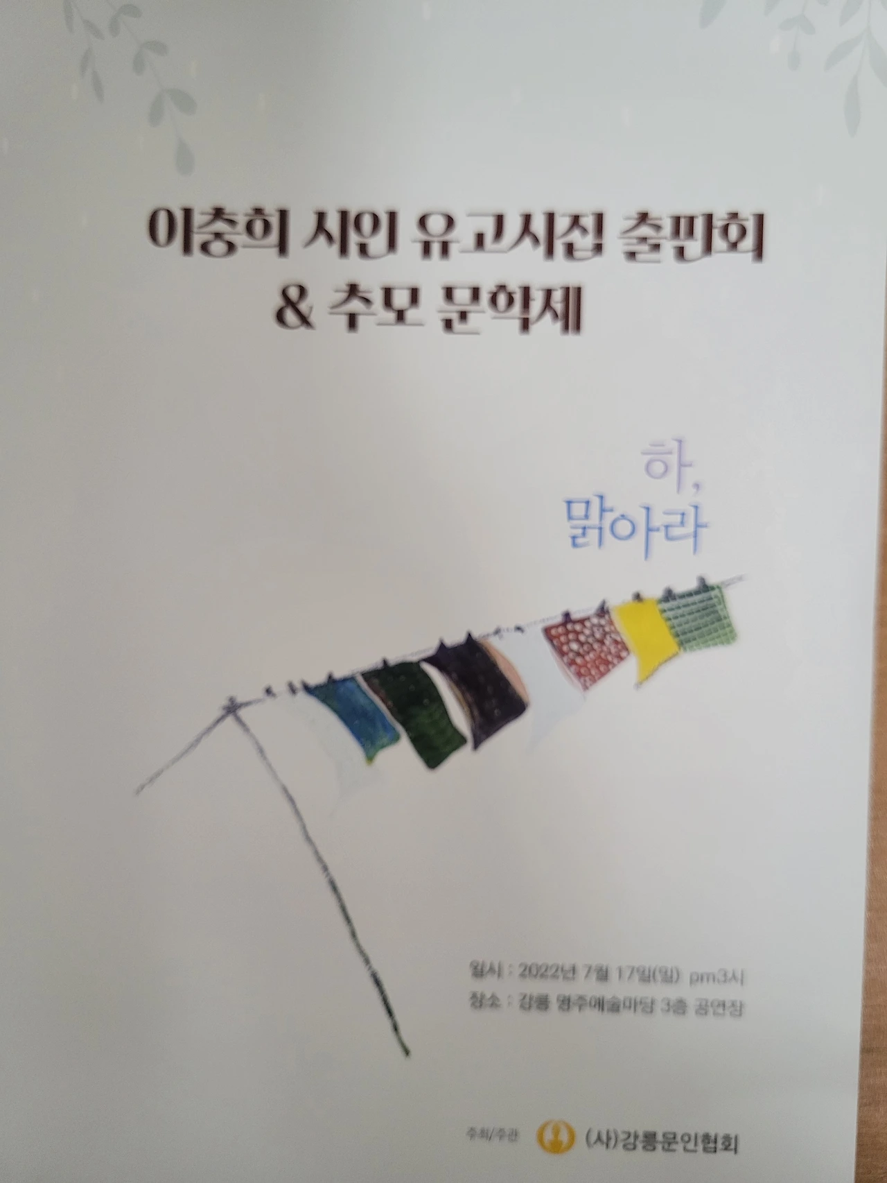 다음날 추모문학제 프로그램과 유고시집을 가지고 엄마 면회를 갔다. 소리는 갈라졌지만 천천히 한자씩 읽으셨다. 그리고는 이충희 시인이 누군지 모르시는 것 같았지만 ‘문학제’라고는 또박또박 읽으셨다.