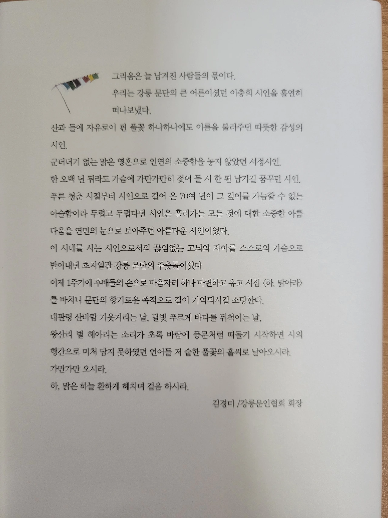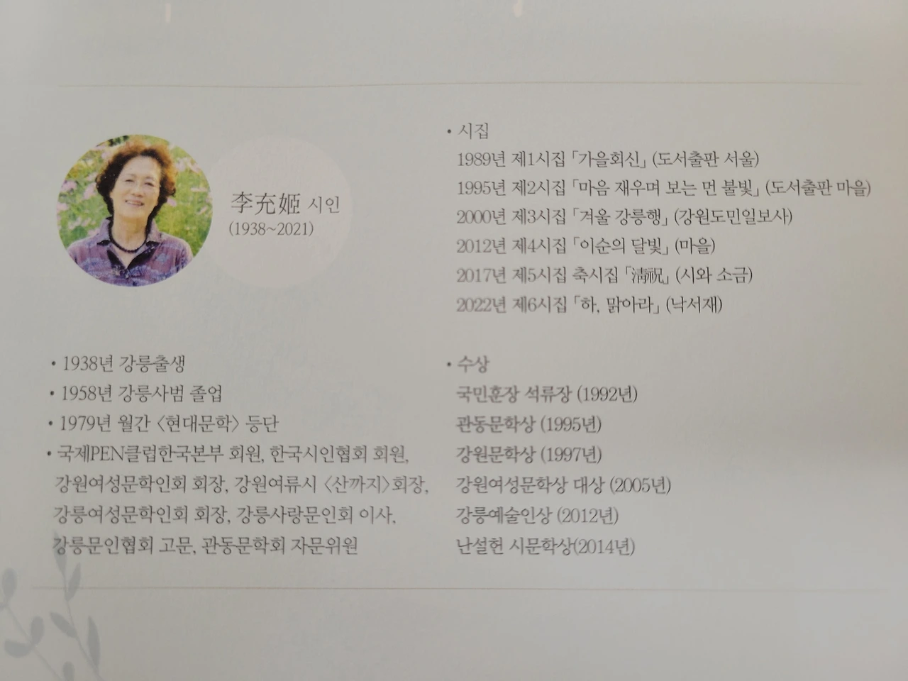 강릉을 대표하는 문인으로, 시인으로 사셨던 선생님을 기리며 이 유고집이 나오기까지 애쓰신 모든 분들의 노고에도 감사드리고 싶다. 이렇게 의미 있는 행사에 나그네처럼 찾아와, 마음을 올려 드릴 수 있으니 이보다 더 감사한 일이 있을까.