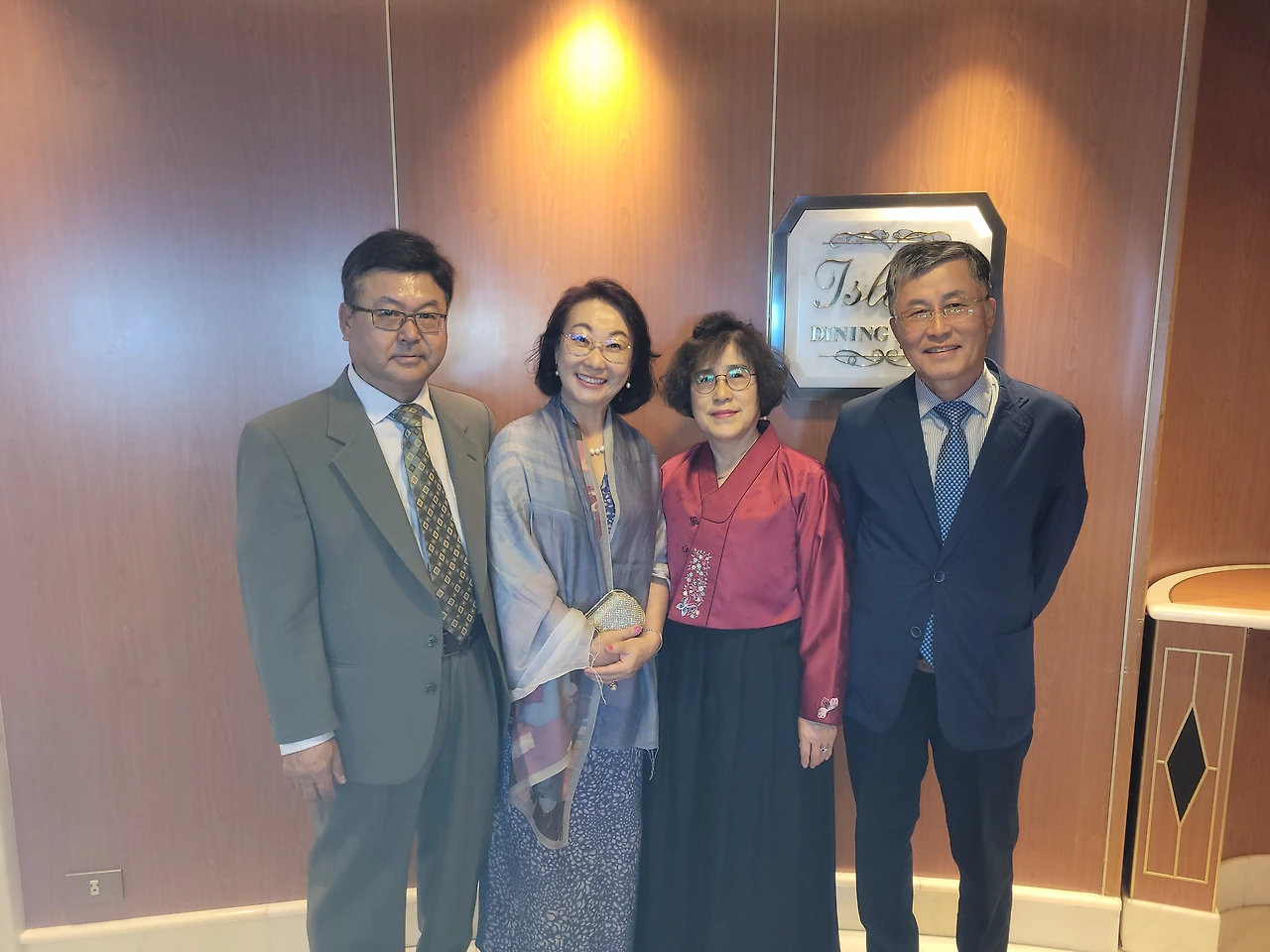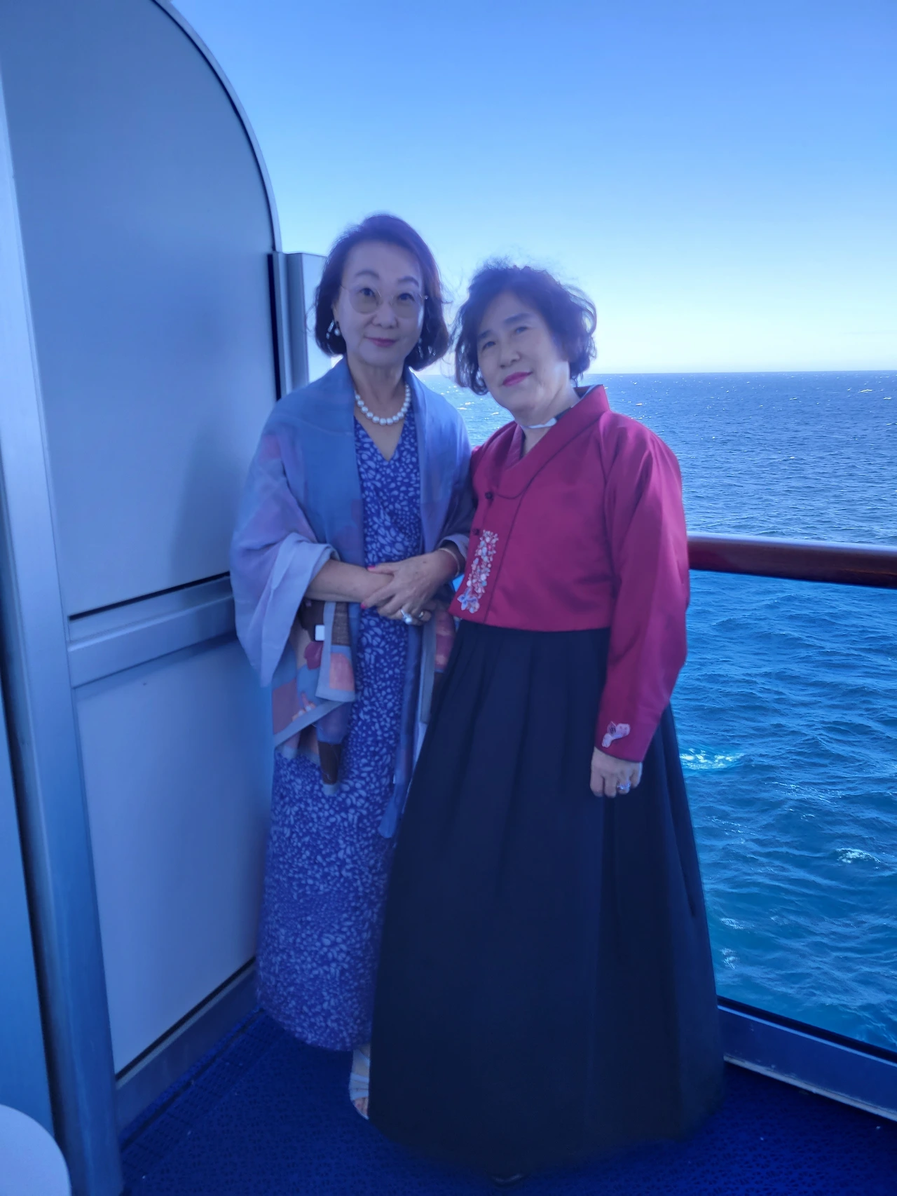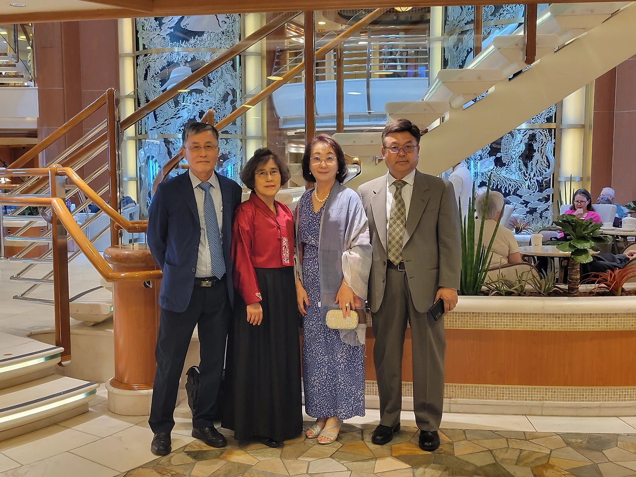 배에서 조명이 가장 잘 받을 것 같은 몇 곳에서 사진을 찍고, 샴페인 따르는 행사도 보기 위해서였다. 친구는 정장으로 개량 한복을 준비해 왔다. 지나가는 손님들이 모두 우리에게 시선이 오는 것 같았다. 친구의 전통의상이 사람들의 시선을 끌기에 충분했나 보다.