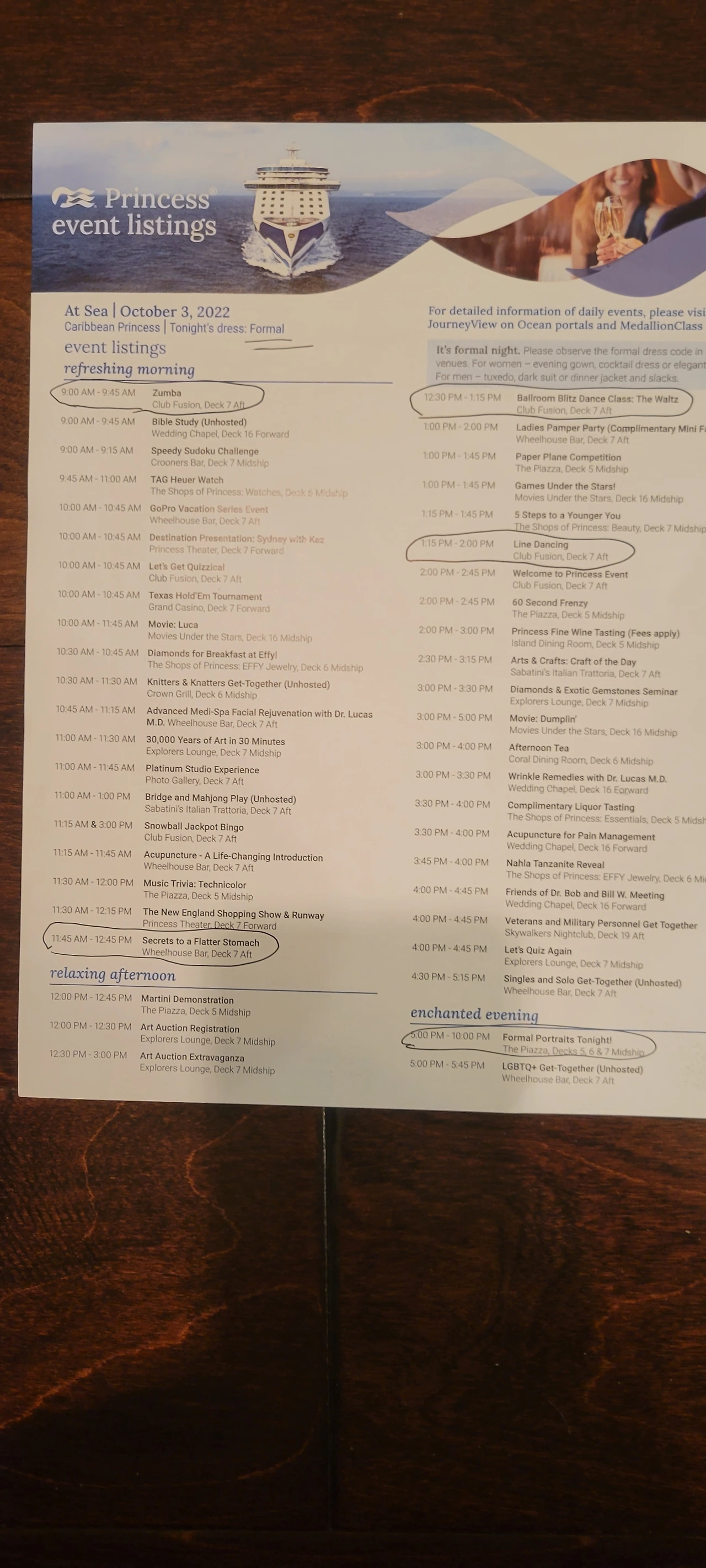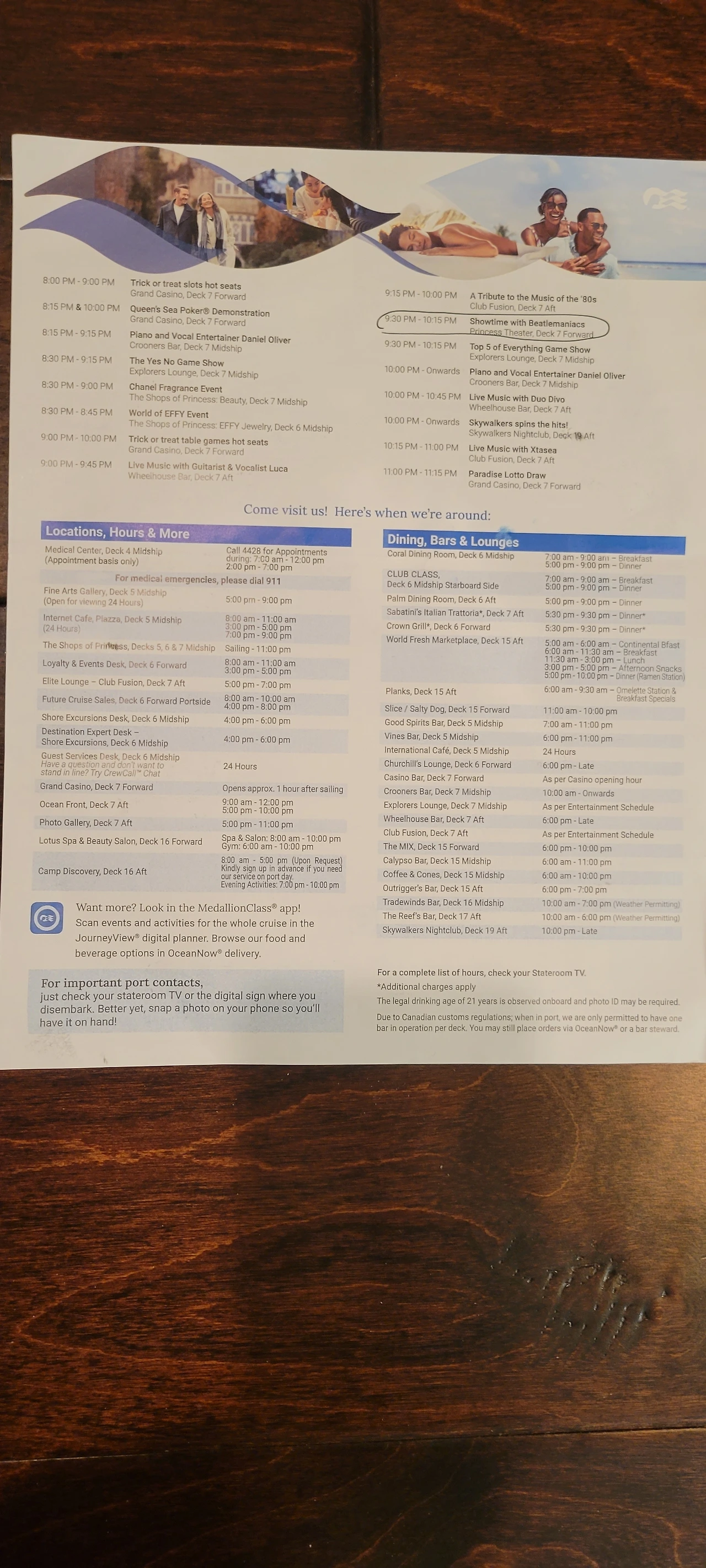크루즈 안에는 매일 방으로 배달되는 신문이 있다. 그날 하선하는 곳의 날씨와 그 도시의 역사와 문화를 전해주고 꼭 봐야 할 곳들을 알려준다. 물론 이 신문조차도 쿠르즈가 주관하는 그날의 볼거리를 예약하고 가보라는 상술이긴 하지만, 그 내용을 읽어보며 무엇을 봐야 할지, 하루를 계획하는 데는 도움이 된다. 배 안에 있을 때와 하선 후의 날씨가 다를 때가 무척 많으므로, 그날 입을 옷을 결정하는데도 도움이 된다. 비가 온다는 예보가 있으면 우비를 준비하거나 우산을 갖고 내리고 바람이 분다면 얇은 재킷을 여분으로 준비하는 등등 말이다.