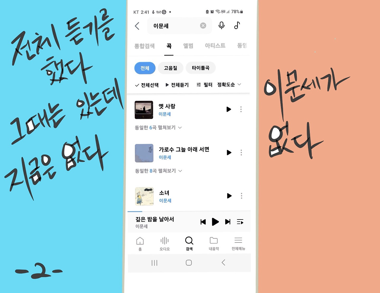 근데 얼마 전까지 내게서 이문세는 사라졌었다 가끔씩 생각이나 찌니에서 이문세 전체 듣기를 했었는데 그 시절 그 노래 외에는 도무지 예전 감정이 살아나질 않았다 과거와 현재가 뒤섞이다 보니 나의 이문세가 사라진다(순전히 본인 생각임)