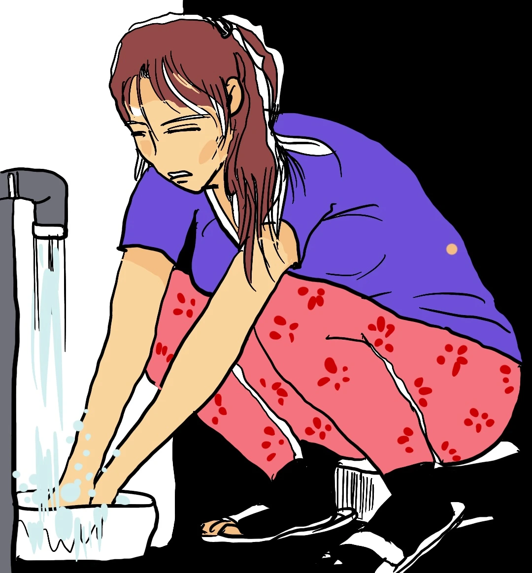 코앞, 한눈에 그녀임을 알 것 같은 소녀가 쪼그리고 앉아 무언가를 씻고 있는 게 아닌가 나는 너무 반가웠으나 뭔가 느낌이 쎄했다