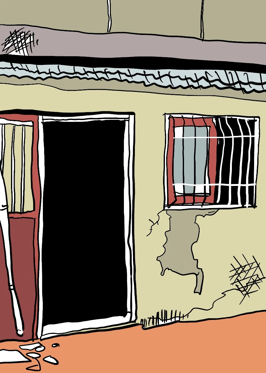 한쪽으로 드르륵 열리는 낡은 미닫이문, 문은 열려 있고...