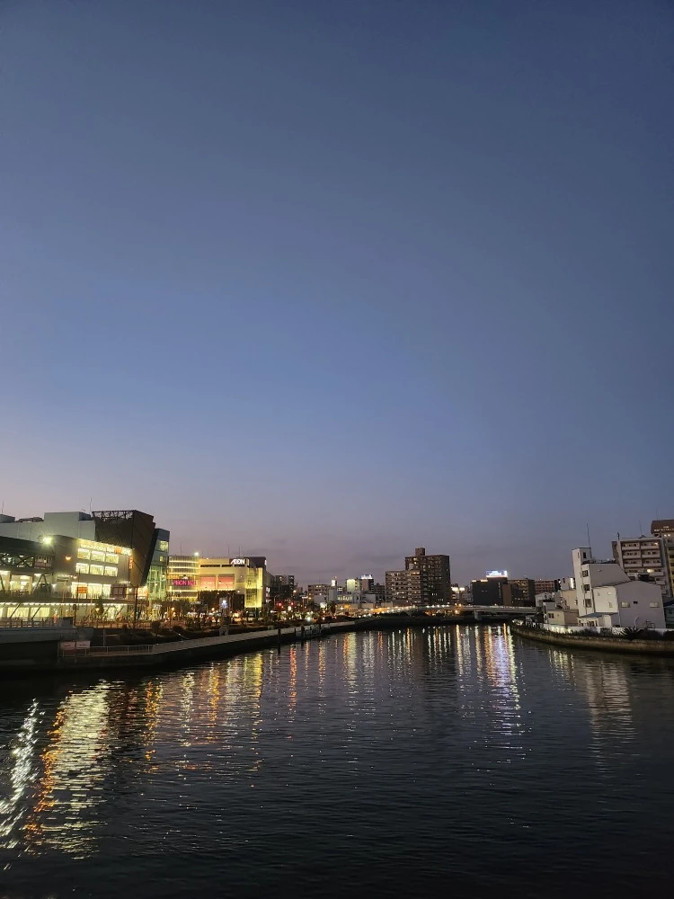 교세라 돔을 다 돌아보자 어느덧 저녁시간이 되었다. 교세라 돔과 연결이 되어있는 AEON 오사카 돔 시티점을 둘러본 뒤 그곳 푸드코트에서 저녁을 해결하기로 했다. 여기서도 느낀 일본의 특징은 서점이 어딜가든 크다는 것, 2D 같은 취미를 가진 사람들에게도 열려있다는 것이였다. 우리나라의 경우 서점을 찾아보기가 힘들고 서점이 사라져가는 추세인 반면 일본은 좀 규모가 있는 지하철역이나 일반 백화점 내부에도 서점이 모두 크게 자리를 차지하고 있다. 시장에도 서점이 있고 대학 근처에도 당연하게 위치하고 있다. 지하철에서도 책을 읽는 사람들을 심심치 않게 볼 수 있다. '독서'를 많이하는 일본인들의 자세 한국인들도 배우면 좋을 것 같다. 우설 돈까스를 먹고 이번에는 왔던 길을 그대로 가는 것이 아닌 약간 돌아서 가보기로 했다. AEON백화점에서 내려와 다리를 건너 사쿠라가와역, 오사카난바역 방향으로 쭉 걸어오는 경로를 택했다. 오는 길에 다리를 건너기 전 본 야경도 아름다웠다.