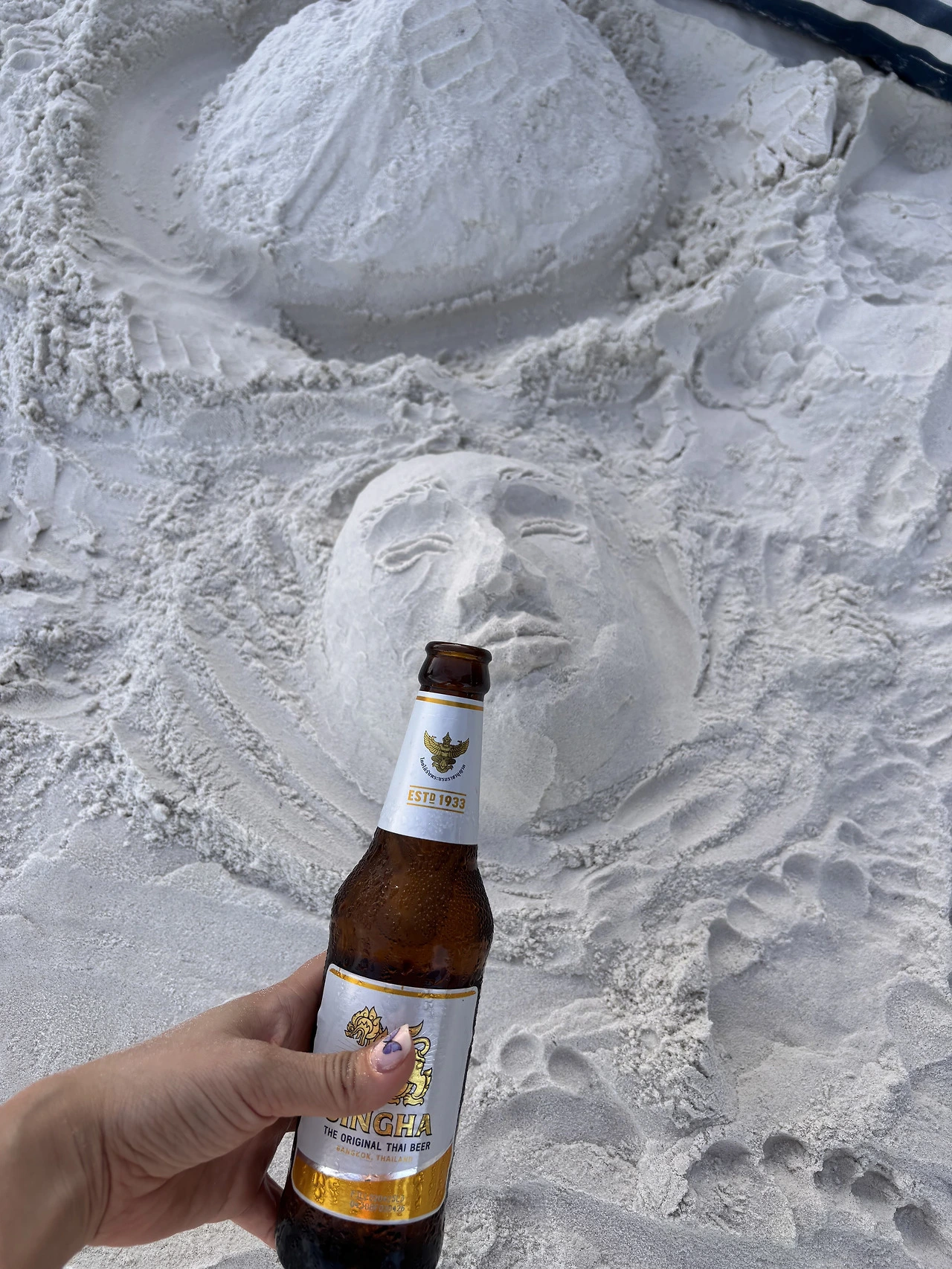 리조트 비치바에서 모래 위에 앉아 먹는 식사.