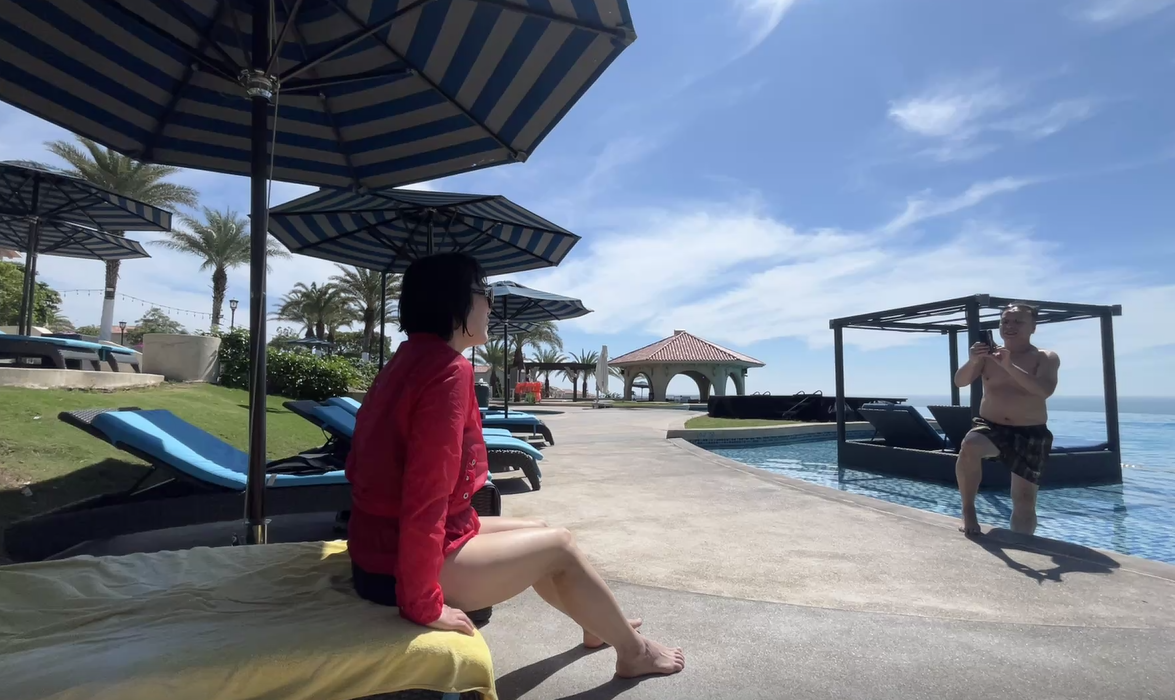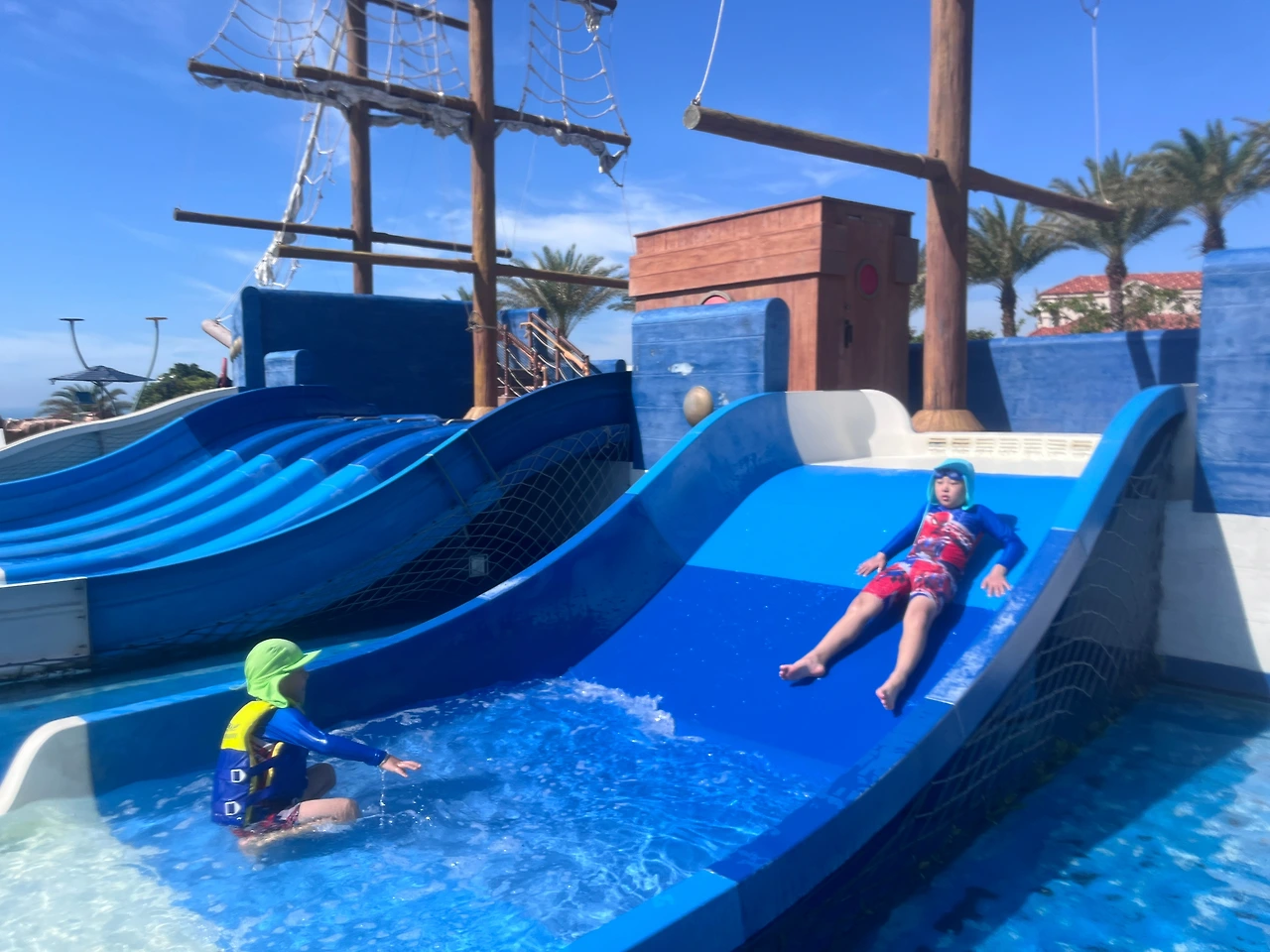리조트에는 총 세 개의 수영장이 있었는데, 나는 미끄럼틀이 있는 수영장으로 가고 싶었다. 아이들에게 함께 가자고 설득했지만, 아이들은 "그냥 여기서 놀고 싶다"며 별로 내켜하지 않았다. 그래도 나는 포기하지 않고 "한 번 가보면 정말 즐거울 거야!"라며 상상하게 만들었다. 결국 예온이는 나와 함께 가기로 했지만, 예준이는 여전히 거부했다.