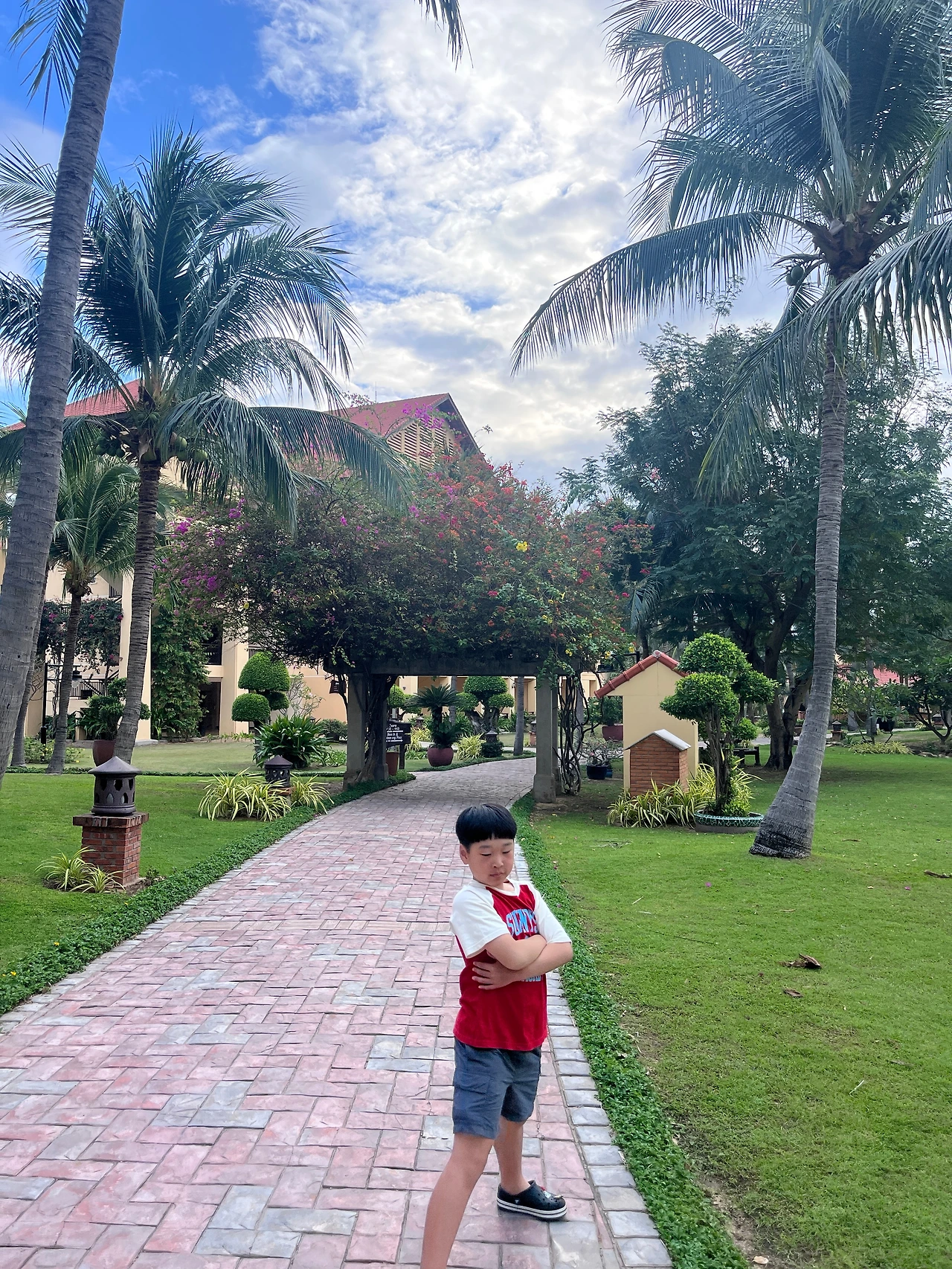 리조트 조식은 여섯 시 반부터 시작이었다. 어른들은 아직 한국 시간에 익숙해져서 모두 일찍 일어나 계셨다. 단체 카톡방에 메시지를 보내 조식을 먹으러 가자고 했다. 이른 아침이라 리조트는 고요했고, 바람 소리가 들려와 상쾌한 기분이 들었다. 레스토랑으로 가는 길은 분홍빛 꽃들이 즐비했다. 멀리선 파도소리가 들려왔다.아이들은 일어난지 오래된 것 처럼 활기찼다. 레스토랑은 층고가 높고 사방이 탁 트여 있었으며, 아침 햇살이 밝아 내부가 상대적으로 어둡게 느껴졌다.