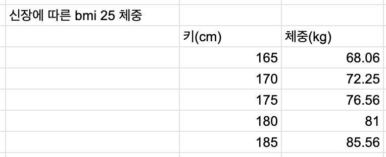 신장에 따른 BMI 25 체중 그런데 키빼몸 100을 첨부한 표와 함께 보면 충격적인 결과가 나온다. 한국의 남성 비만의 기준을 아직도 BMI 25 이상으로 정의하고 있는데, 키빼몸 100에서 조금만 더 린매스업을 하는 순간 비만으로 분류된다.