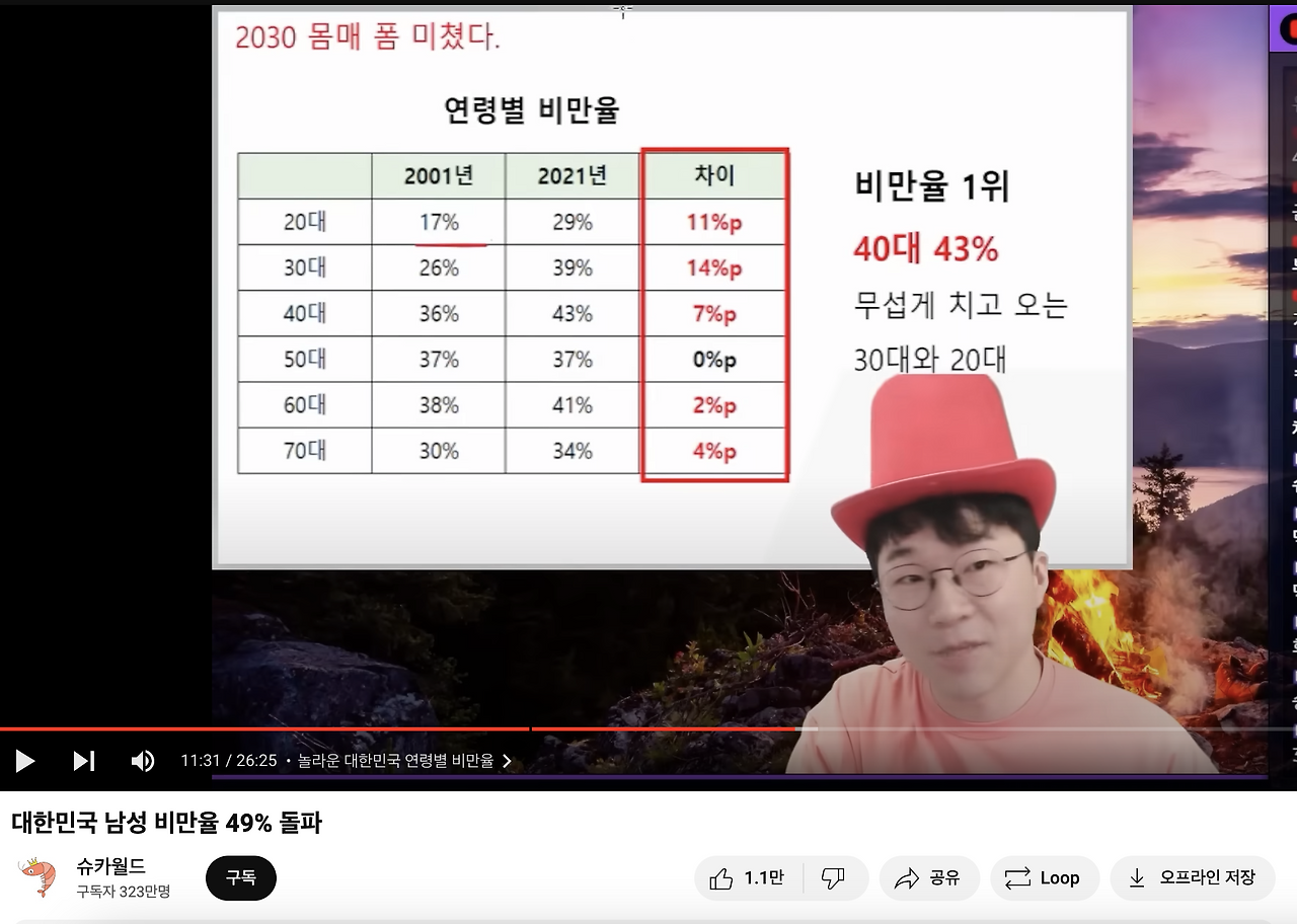 언론 등지에서 심심할 때마다 성인 남성 비만율이 50%에 육박한다고 떠들며 조회수를 챙기는 현상의 실체적 진실이 바로 여기에 있다. 언론의 kpi는 진리 전파가 아닌 클릭 유도이다. 비만인 비율 증가 추이가 식단과 신체의 서구화뿐만이 아니라 헬스(웨이트 트레이닝) 열풍과 큰 관련이 있을 거라고 나는 생각한다.