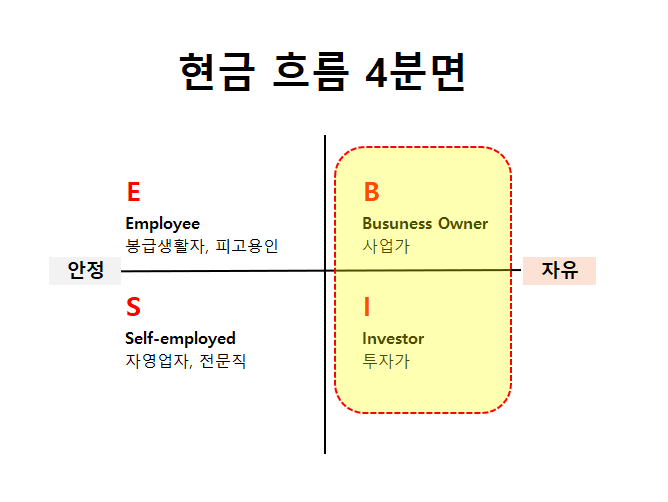 '부자 아빠 가난한 아빠'책 속 내용과 같이 현금 흐름 4분면의 우측을 향해 경로를 수정하려 한다.