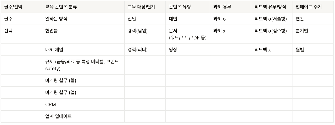 행으로 나열한 각 분류별 옵션을 전부 만들어둘 필요는 없지만 - 예컨대 콘텐츠를 반드시 대면/문서/영상으로 모두 갖춰둘 필요는 없다 - 최소한 빼놓으면 안되는 필수 분류 기준과 항목은 다음과 같다: