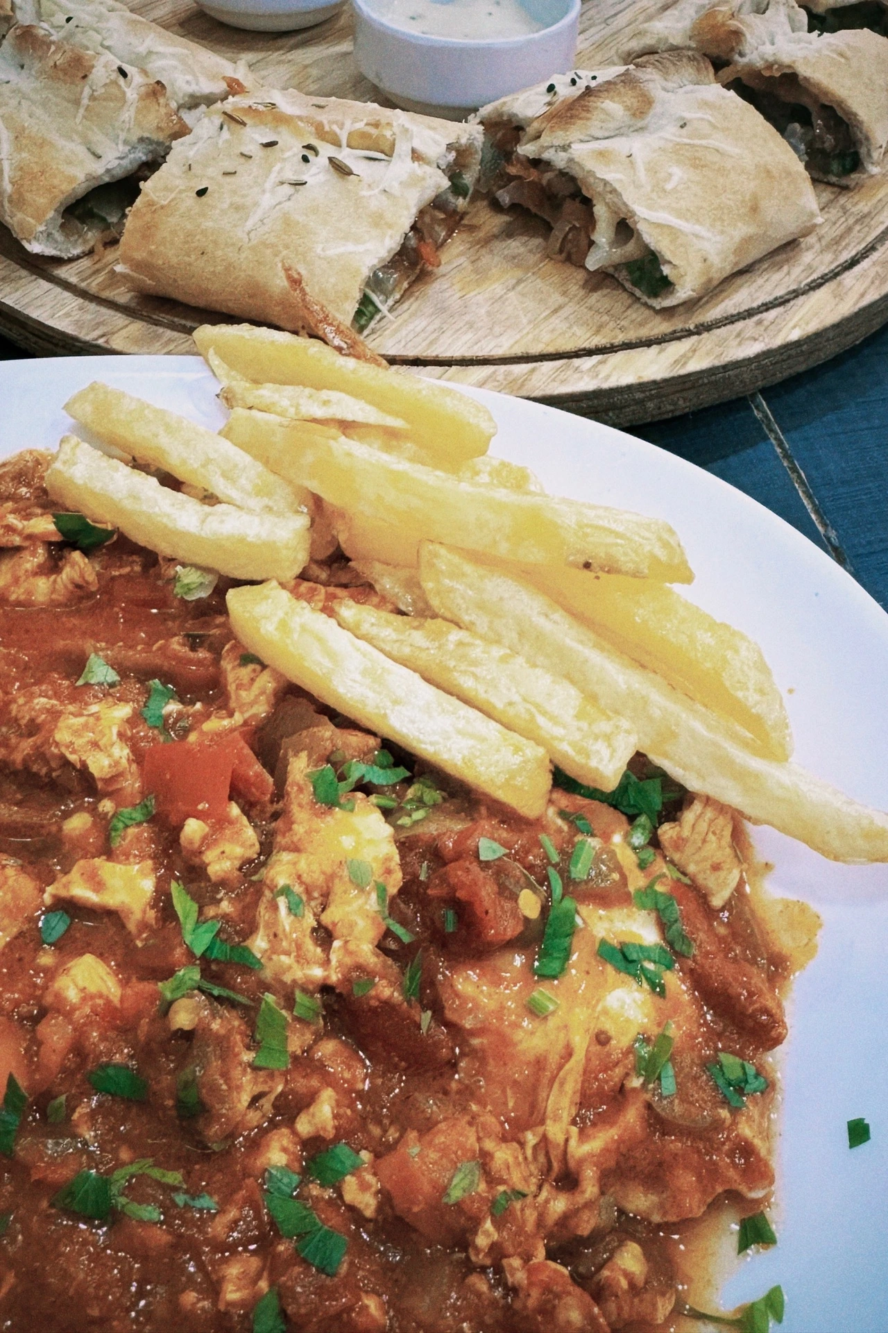 우리는 멋쩍게 웃으며 가게를 나왔고 저녁을 먹으러 근처 식당에 갔다. 호텔 밖에서 먹는 첫 현지 음식이었다. 우리가 시킨 요리는 다진 고기가 들어간 바게트와 오짜(Ojja)였다. 튀니지 고추가 들어간 음식은 정말 맵기 때문에 오짜를 주문할 때는 덜 맵게 해달라고 요청했다. 바게트는 딱딱한 고기 찐빵 맛이었고, 오짜는 매콤한 토달볶 같았다. 덜 맵게 해달라고 했음에도 매운맛이 꽤 강했지만 빵과 함께 찍어 먹으니 맛있게 먹을 수 있었다.