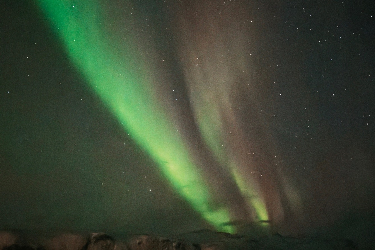 아쉬움을 뒤로한 채 두 번째 장소로 이동했다. 이번에는 꽤 먼 거리를 갔다. 주차 중 창밖을 보니 거대한 오로라가 있었다. 시내에서 봤던 것보다 훨씬 크고 굵게 피어오르고 있었다. 서둘러 버스에서 내렸다. 감탄사가 저절로 나왔다. 몇몇 후기에서 추위 속에서 오로라를 기다렸다던 글도 보았는데, 생각보다 오로라를 빨리 봐서 다행이었다. 오후 8시쯤에 일어난 일이었다.