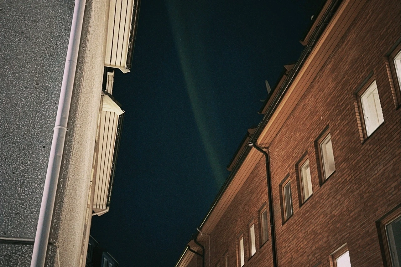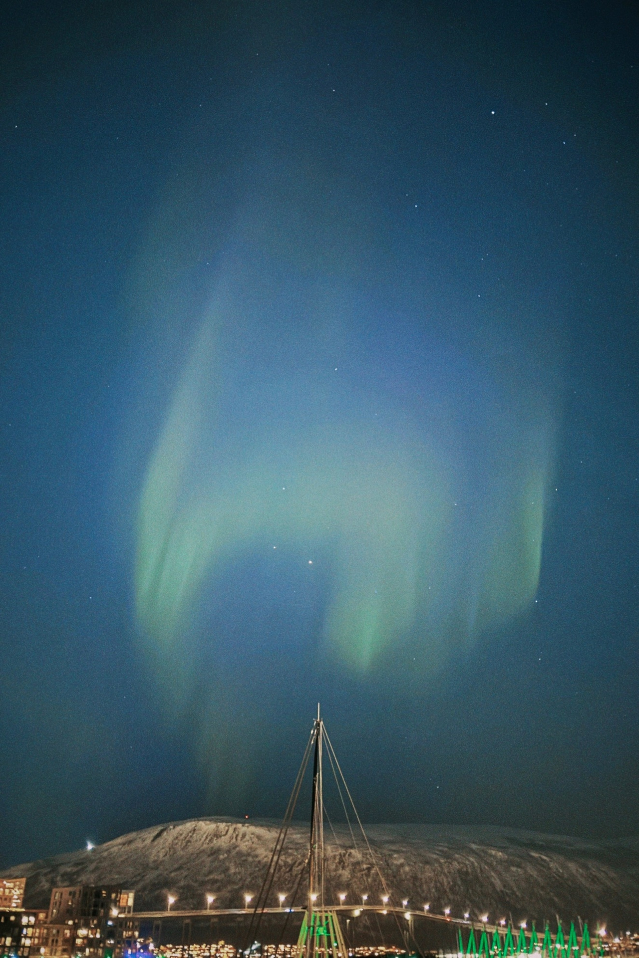카메라로 본 오로라는 훨씬 더 초록빛이었다. 밝기를 특별하게 조정하지 않아도 잘 찍히는 선명한 오로라였다. 항구 반대편 건물 틈으로도 오로라가 피어오른 게 보였다. 건물 사이에 피어난 장미가 아니라 오로라라니, 특별한 순간이었다.