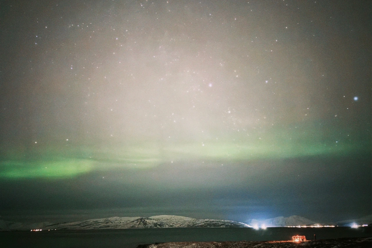 투어 업체와 약속된 시간인 오후 5시 30분보다 일찍 도착해 가이드를 기다리고 있는데 사람들이 항구 쪽을 바라보며 조금씩 모여들기 시작했다. 다들 연신 셔터를 눌러댔다. 우리는, 뭐지? 하고 하늘을 보았다. 무언가 하얀 게 연기처럼 피어오르고 있었다. 오로라였다! 오로라를 생전 처음 본 우리들 눈에는 잘 띄지 않았던 것. 오로라는 육안으로 초록색보다는 하얀색에 가까웠다. 자세히 보면 연둣빛인가 싶기도 했지만 대충 봤을 땐 아주 큰 연기처럼 보였다.