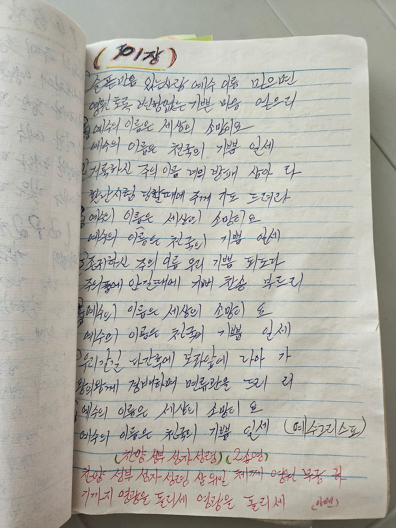 찬송가가 공책 몇 권에 나눠 적혀있다. 어르신이