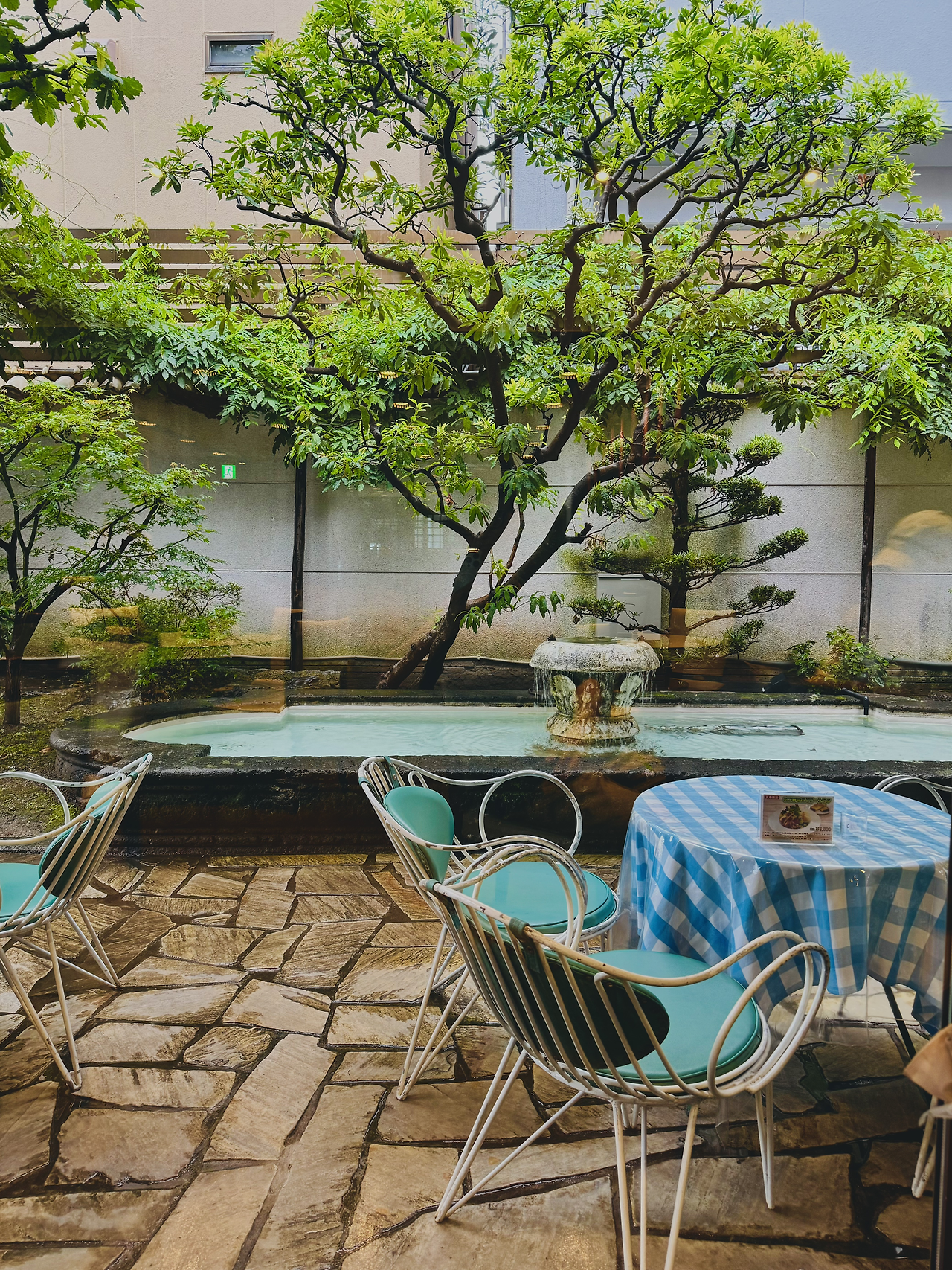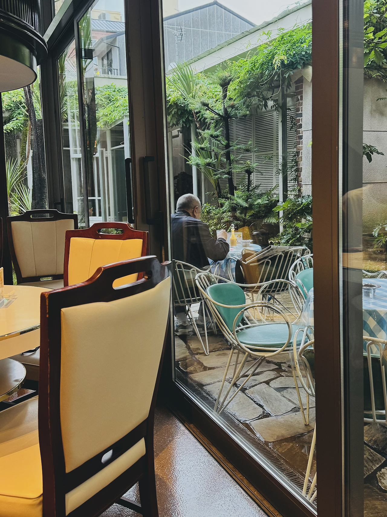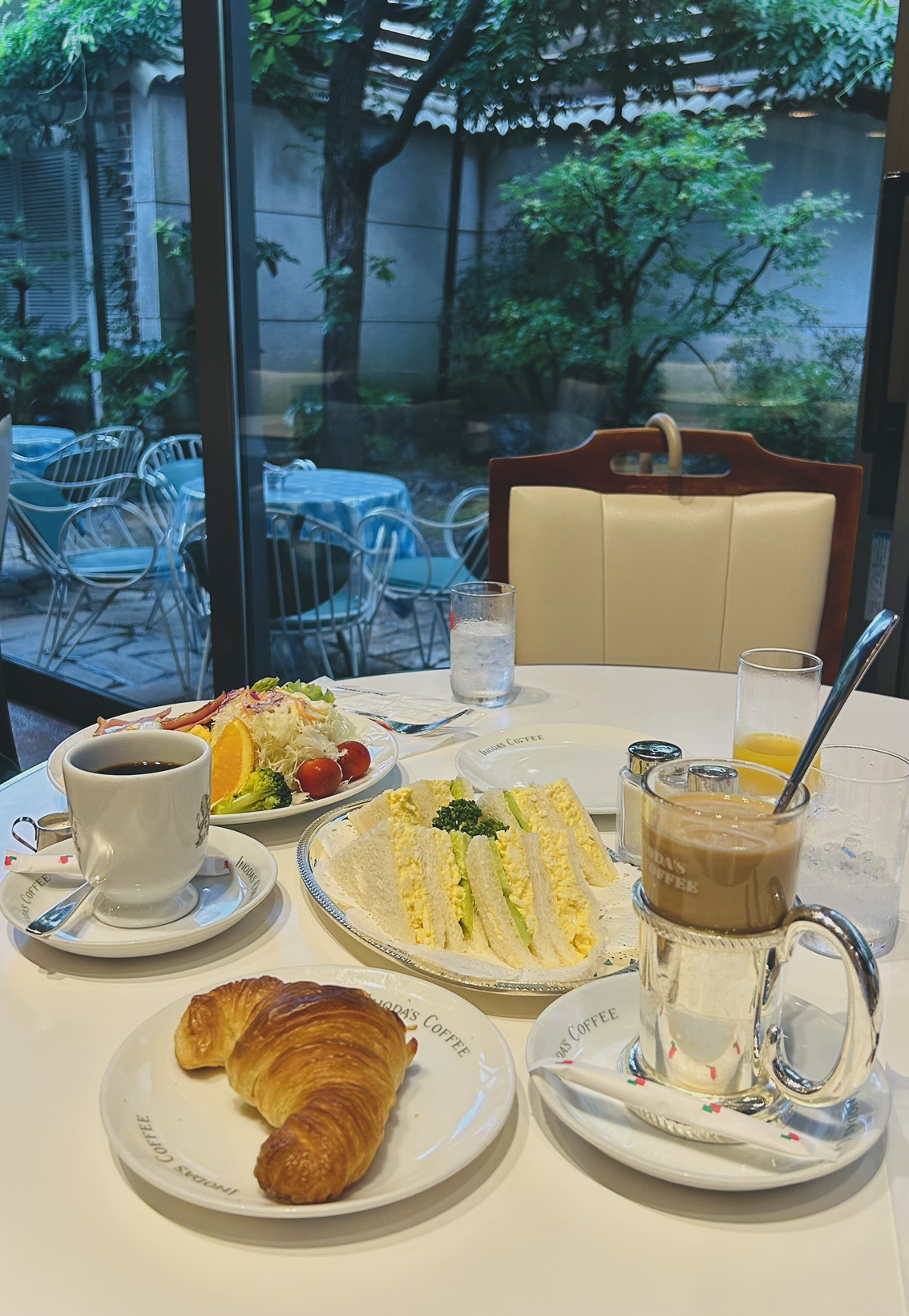 비 오는 아침 동네 마실 가듯 편한 복장으로 찾아간 이노다커피는 정말 훌륭했다. 이곳은 동네 시니어들과 함께 자연스레 어우러지는 공간으로, 유럽인 듯 일본인 듯 묘하게 체리색이 잘 어울리는 브런치 카페이다. 일본답게 유럽의 클래식한 화려함을 잘 정제해 담아낸 공간이다. 특히 푸른 산호초 색으로 치장된 유럽풍의 실외 분수가 멋스럽게 공간의 톤&매너를 맞추며 카페 내외부 공간의 매력도를 높여준다. 교토의 아침은 일찍 시작된다. 아침 7시가 조금 넘은 시간인데도 잘 차려입고 나와 아침식사나 커피를 즐기는 시니어들이 눈에 많이 띄었다. 이노다커피는 이미 굿즈 기념품숍도 공간 한 켠에 준비되어 있을 만큼 서비스부터 메뉴까지 짜임새가 좋았던 것으로 기억된다.