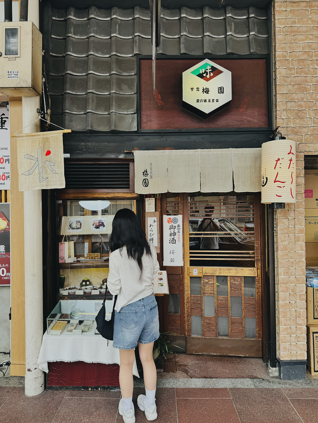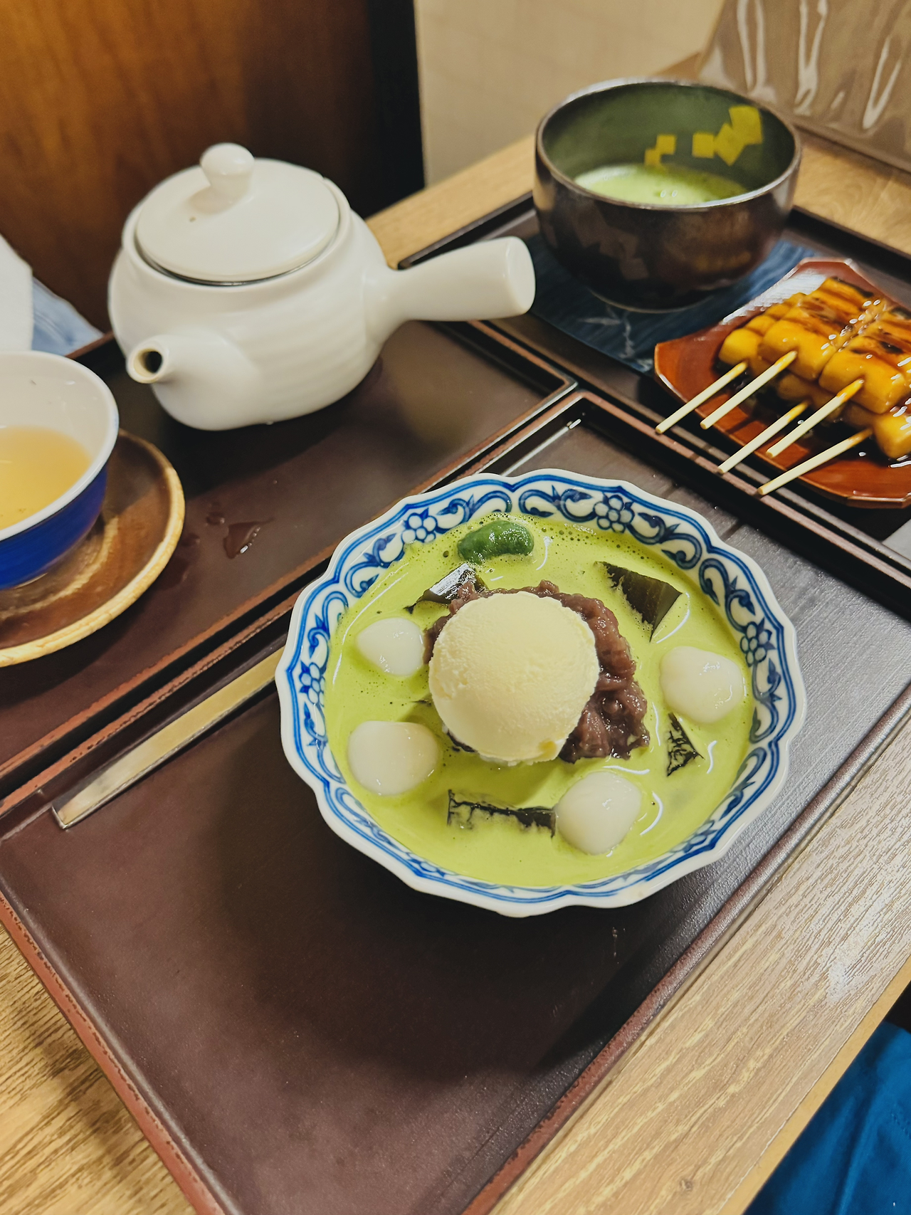 얼마전 '놀면뭐하니'에서 소개된 곳으로 충북 옥천에 풍미당 '물쫄면'이 있다면, 일본 교토에는 '물팥빙수'가 있으려나. 빈티지 느낌이 물씬 풍기는 작고 아늑한 공간에서 생소한 비주얼의 녹차물에 말아먹는 팥빙수를 주문해 보았다. 맛은 예상 가능한 맛! 어딜 가나 당고는 기본이고요.