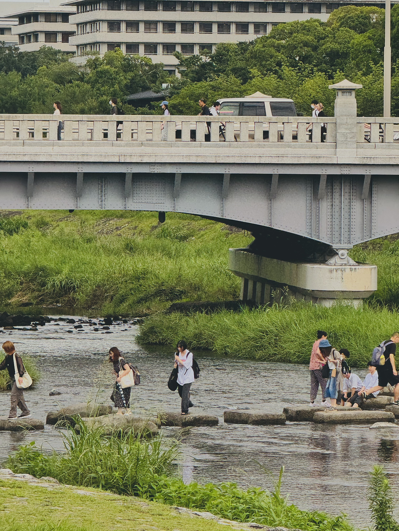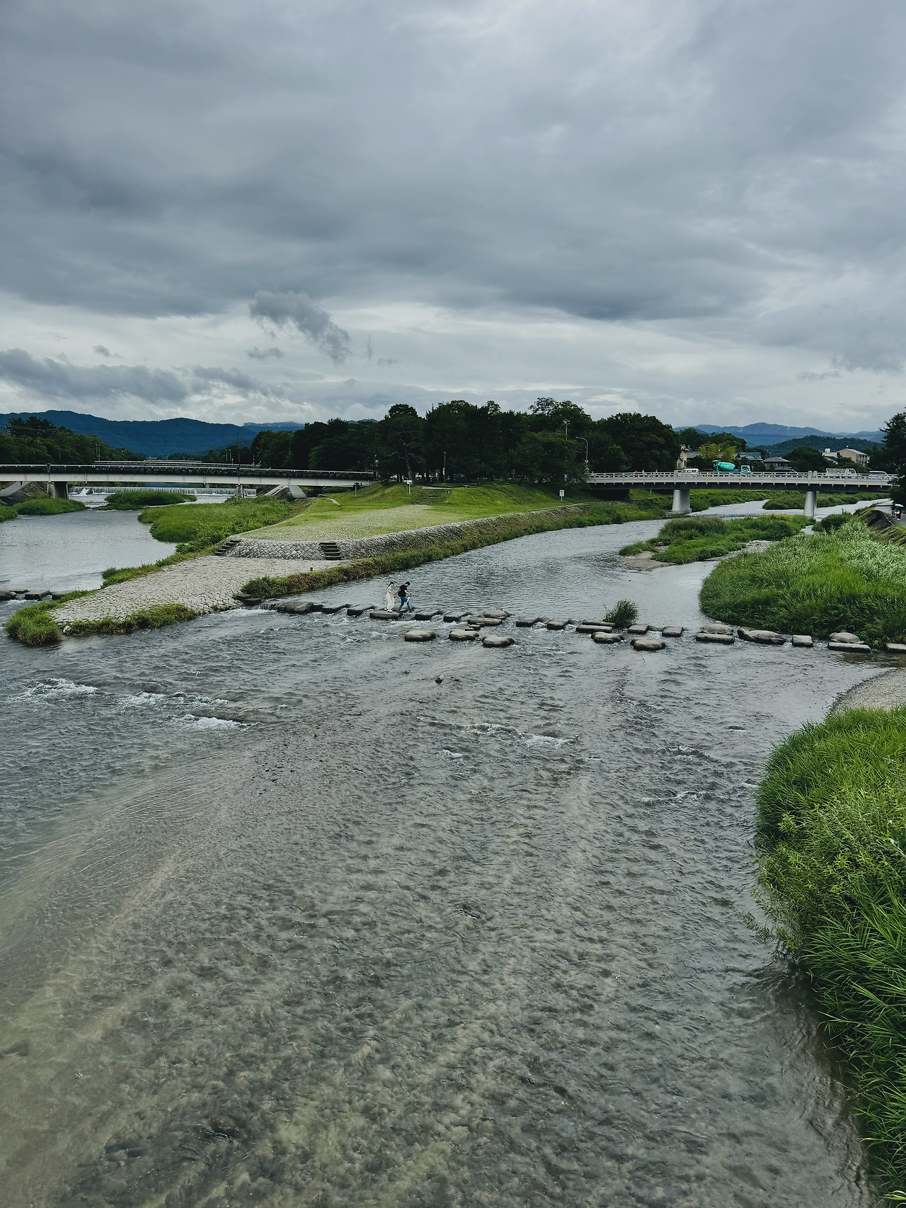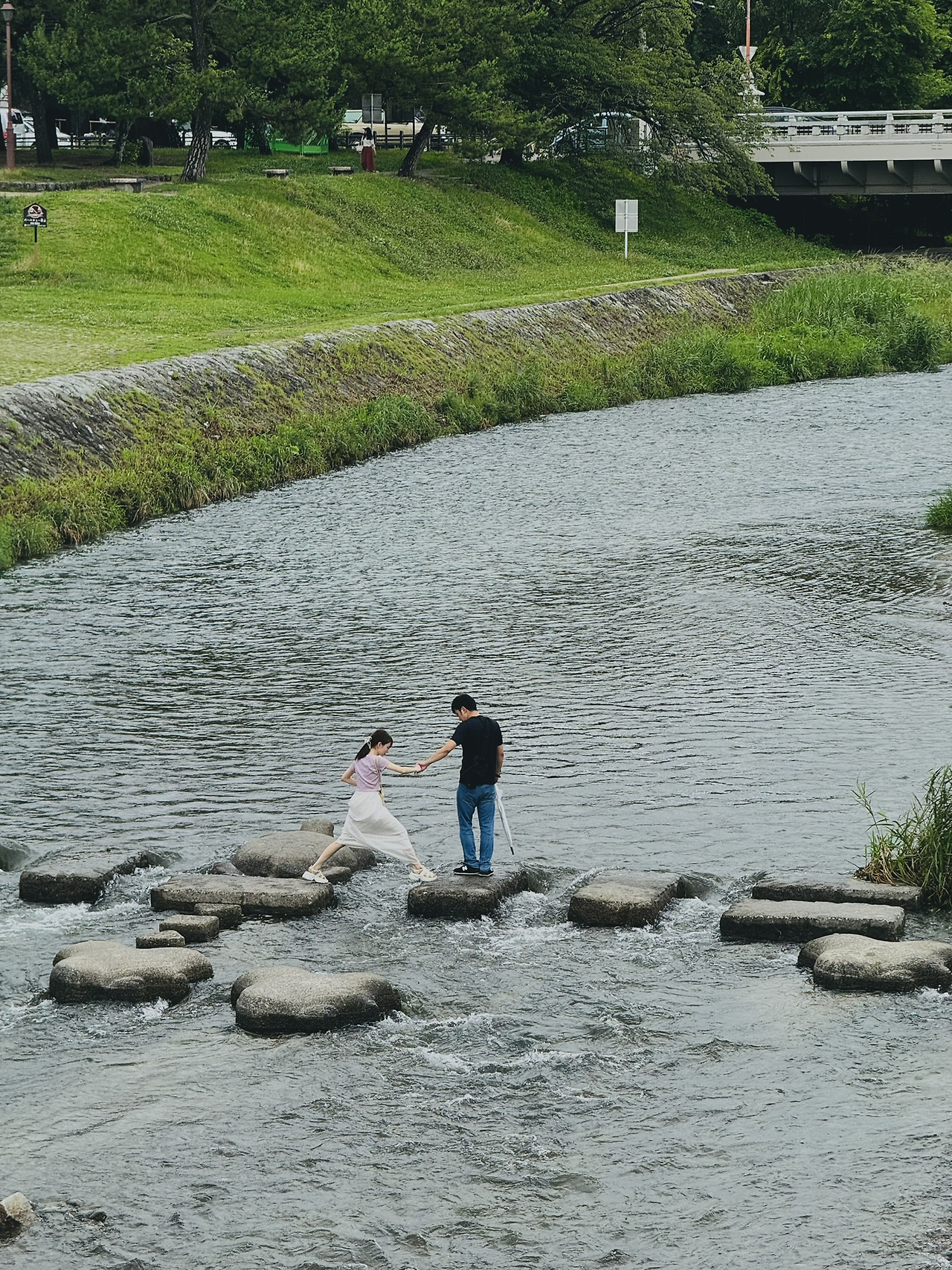 교토 '가모강' 징검다리를 건너는 사람들