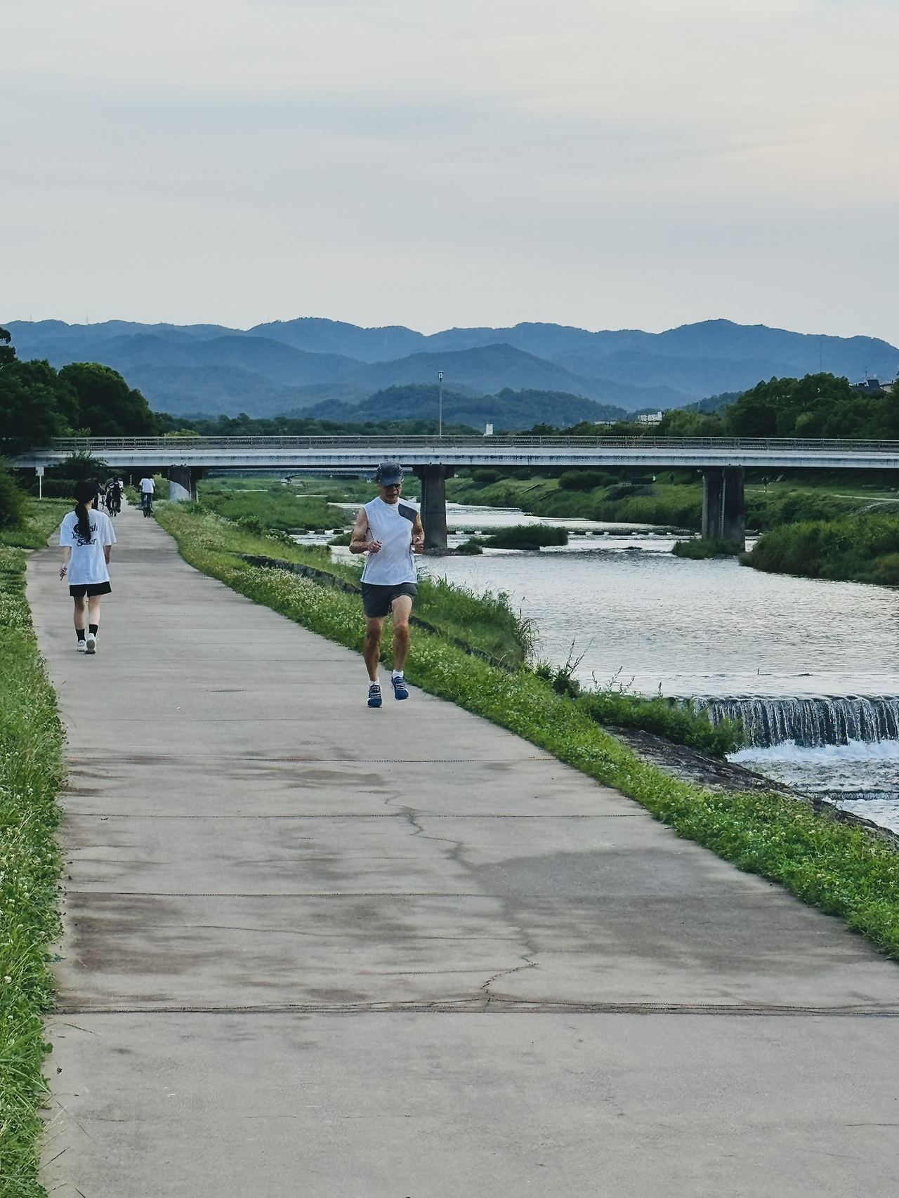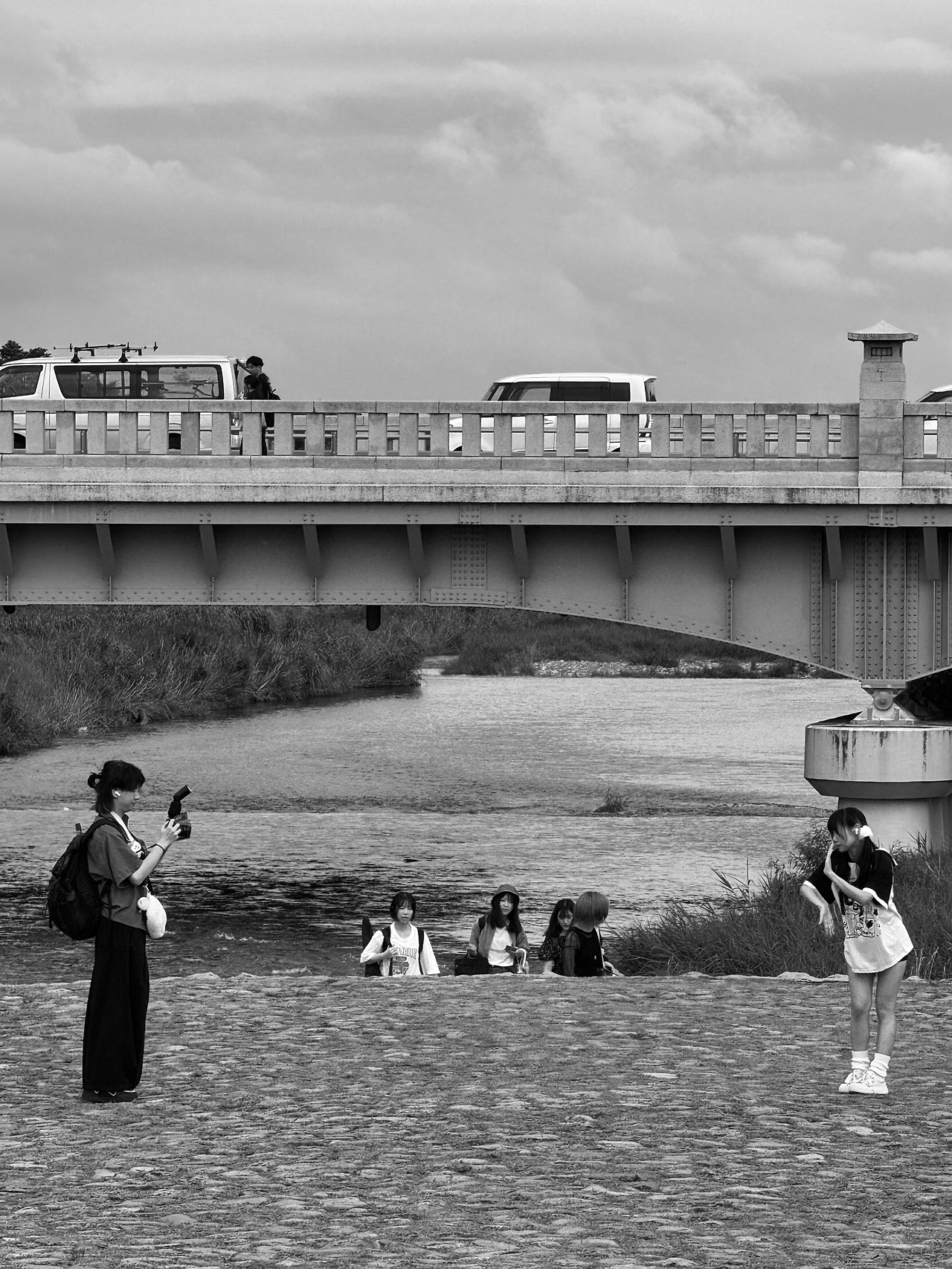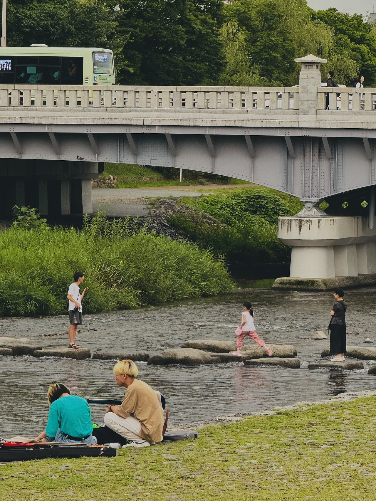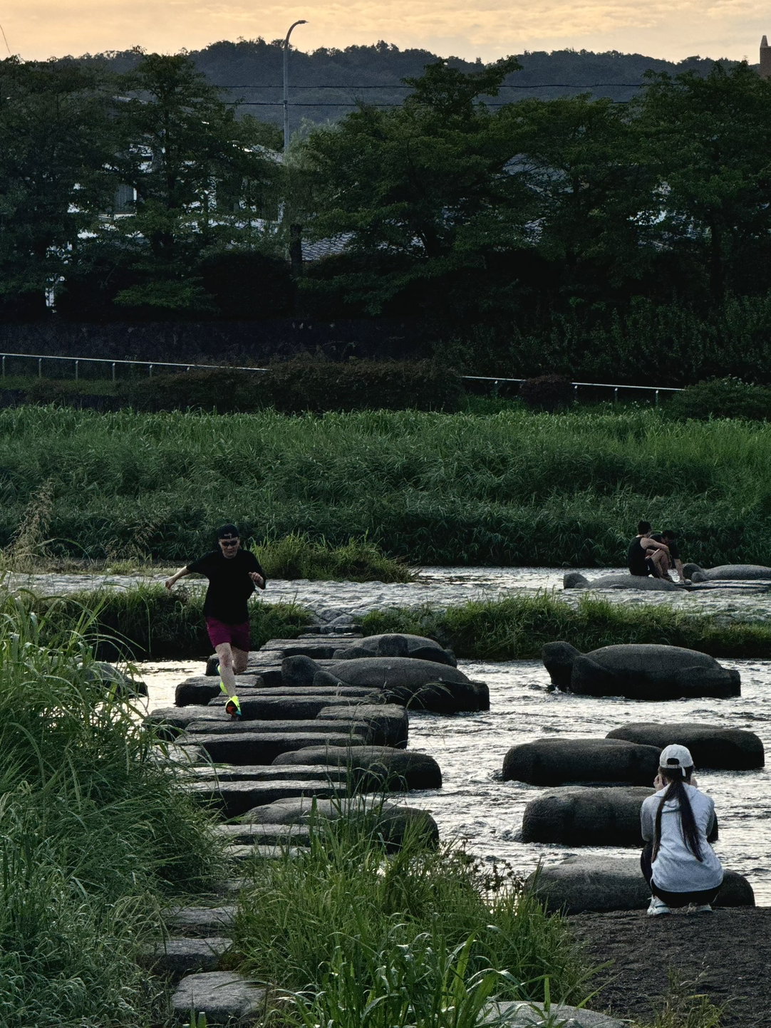 교토 '가모강' 징검다리를 건너는 사람들