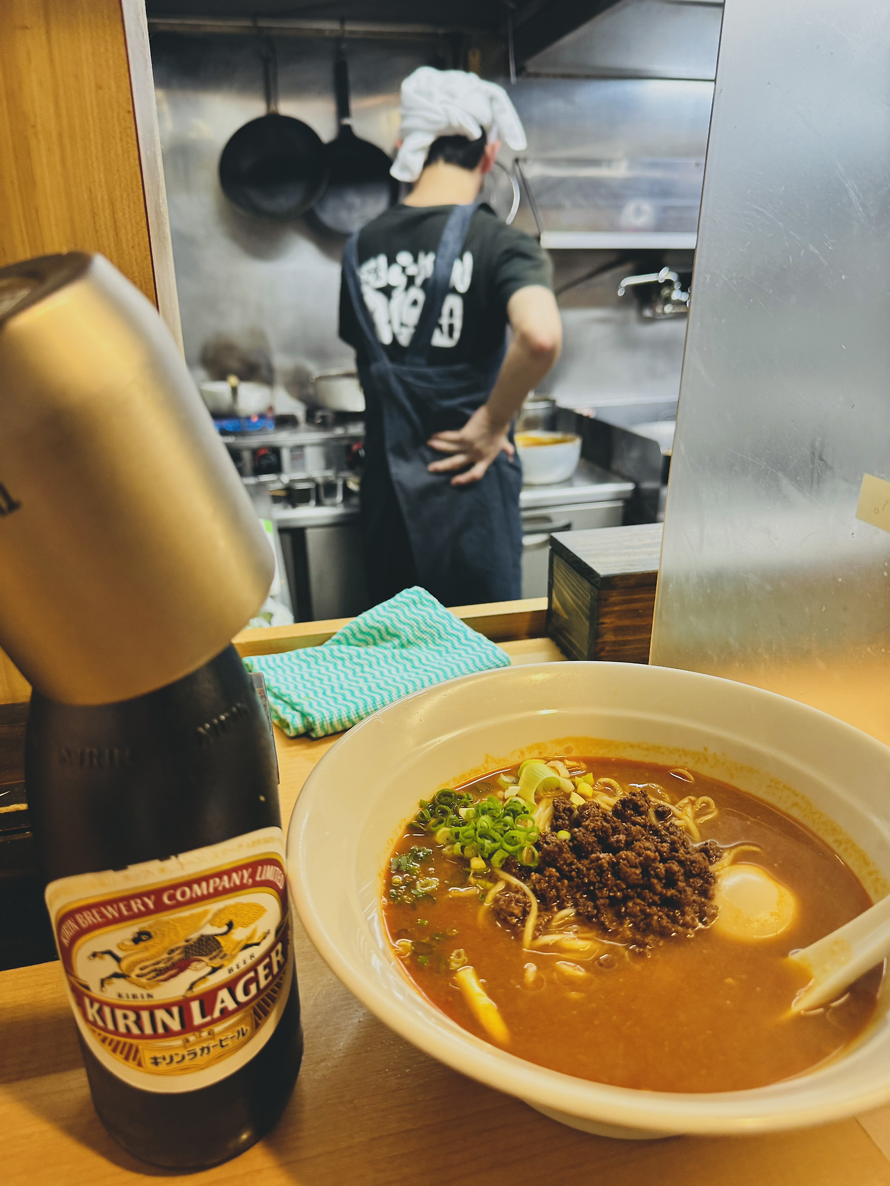 '이치란 라멘'을 찾아가 보려 했지만, 인근에 없었고 무엇보다 프랜차이즈 라멘맛 대신 동네사람들이 인정하는 동네 라멘 고수의 집을 찾아보고 싶었다. 호텔 카운터로 가서 근처 라멘 맛집을 추천받아 찾아간 곳이다. 오픈 10분 전에 도착했지만 이미 15명 정도가 줄을 서고 있었다. 현지인들과 관광객이 반반 정도 섞여 있는 줄로 보아하니 이미 SNS에도 소문난 동네 라멘 맛집인 모양이다. 특이했던 점은 줄을 서 있다가 안으로 들어가 자판기로 메뉴를 고르고 결재하면 쿠폰이 나오고, 이걸 들고 다시 밖으로 나가 줄을 서고 있으면 직원이 나와 이를 걷어 간다. 뭐가 이리 복잡하지 싶은데 암튼 여긴 그런가 보다. 단체 손님 사이에서 혼자 하는 식객은 구석자리로 안내되기 쉬운가 보다. 오늘도 제일 안쪽 편안하게 자리잡고 미친 듯이 미소라멘과 기린라거 맥주를 연거푸 흡입하고 나왔다. 뿌듯했다.