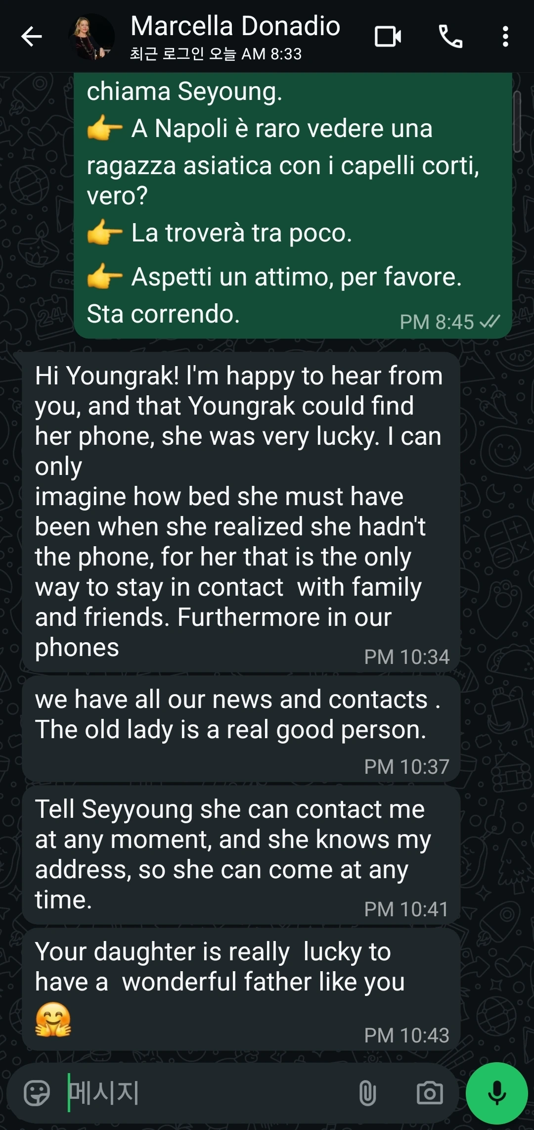 이런 말들을 전화기 너머로 외치며 통화를 계속했어요. 약 20분 후, 딸아이가 Via Duom 264 근처 길 건너에서 두리번 거리는 모습을 발견하고는 "Saeyoung! Saeyoung!" 부르며, 딸 아이를 알아본 거예요. 그때까지도 저는 그 분과 계속 통화를 이어갔어요.