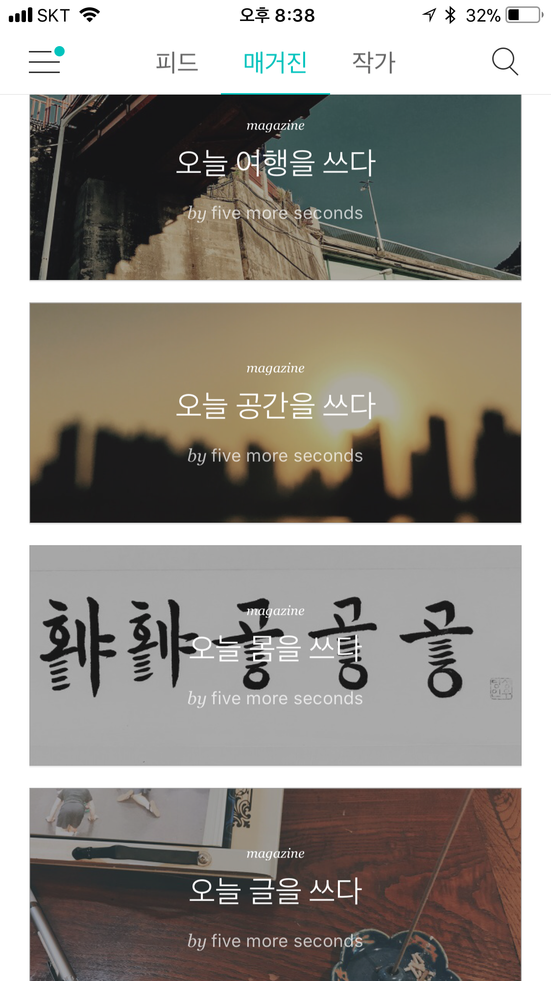 운동을 좋아하니 ‘몸’, 여행을 늘 꿈꾸니 ‘여행’, 빛과 건축을 좋아하니 ‘공간’, 그리고 ‘글’, 이렇게 4개의 매거진을 만들었고, 제 인생 처음 시작하는 정기적인 글쓰기를 시작했습니다.
