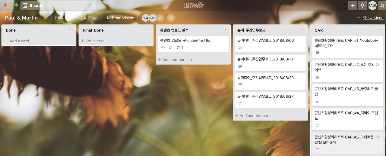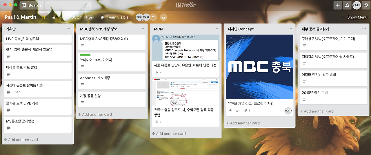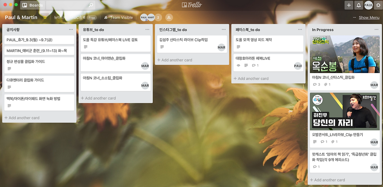 '트렐로' <Paul & Martin> 보드에 기록되는 리스트(이 리스트 아래에는 업무 목록을 의미하는 카드가 배열됩니다)는 '공지사항', '유튜브_to do', '인스타그램_to do', '페이스북_to do', 'in Progress', 'Done', 'Final Done', '콘텐츠 업로드 실적', '뉴미_주간업무보고', 'CAR', '기획안', 'SNS 계정 정보', 'MCN', '디자인 Concept', '내부문서 즐겨찾기' 등입니다.