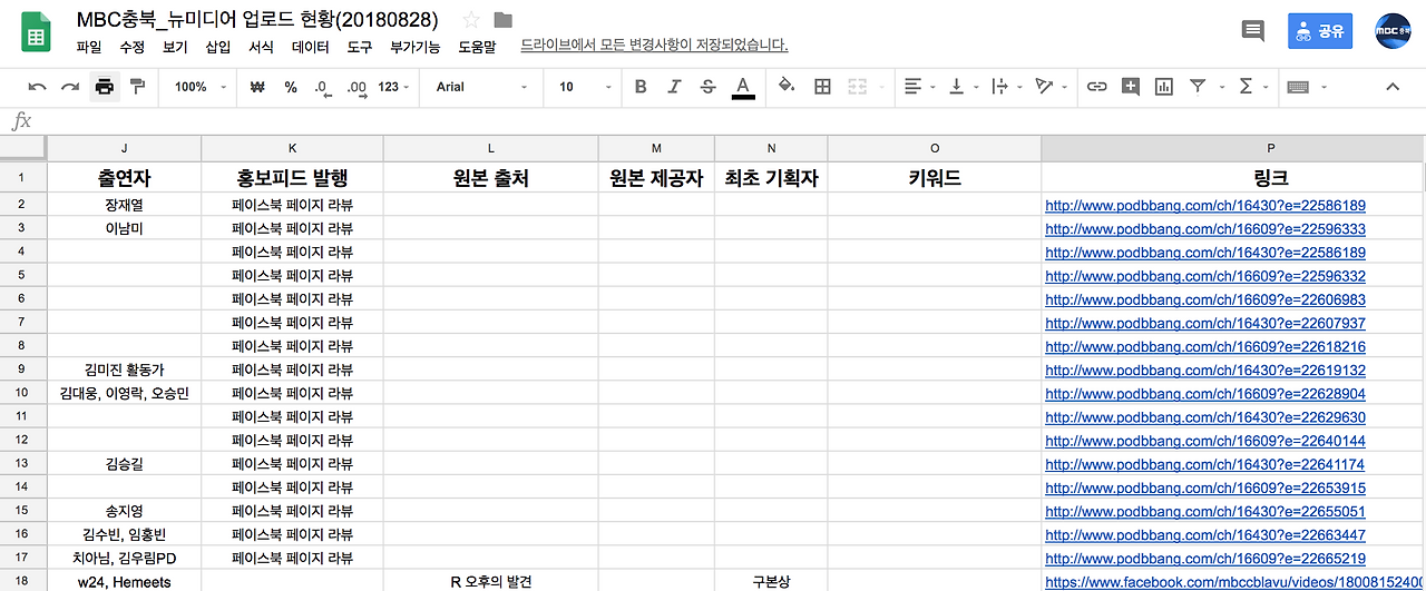 회사원이라면 누구나 사용한다는 '엑셀'을 저는 아직 제대로 사용할 줄 모릅니다. 방송 제작 현업 부문에 있다 보니, 엑셀 같은 프로그램을 사용할 일이 별로 없었던 것도 이유입니다. 뉴미디어 업무를 맡고, '이번 주 무슨 일을 어떻게 했지?'라고 회사가 물어볼 때 설명하기가 쉽지 않더군요. 보도부 김대웅 기자가 '구글 스프레드시트'로 출입처 관련 정보를 공유한다고 했던 말을 떠올려 알아보기 시작했습니다.