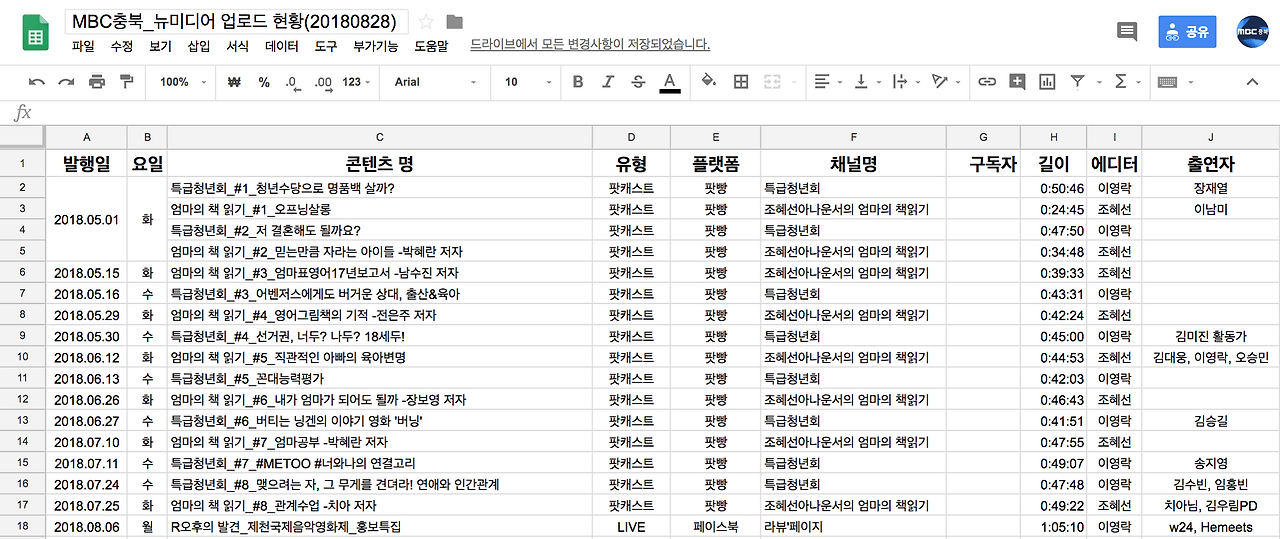 <뉴미디어 업로드 현황>에 기록되는 항목은 '발행일', '요일', 콘텐츠 명', '유형', '플랫폼', '채널명', '구독자', '길이', '에디터', '출연자', '홍보 피드 발행', '원본 출처', '원본 제공자', '최초 기획자', '키워드', '링크' 등입니다. 추가로 메타 데이터까지 더하면서 완성도를 높여나갈 생각입니다.