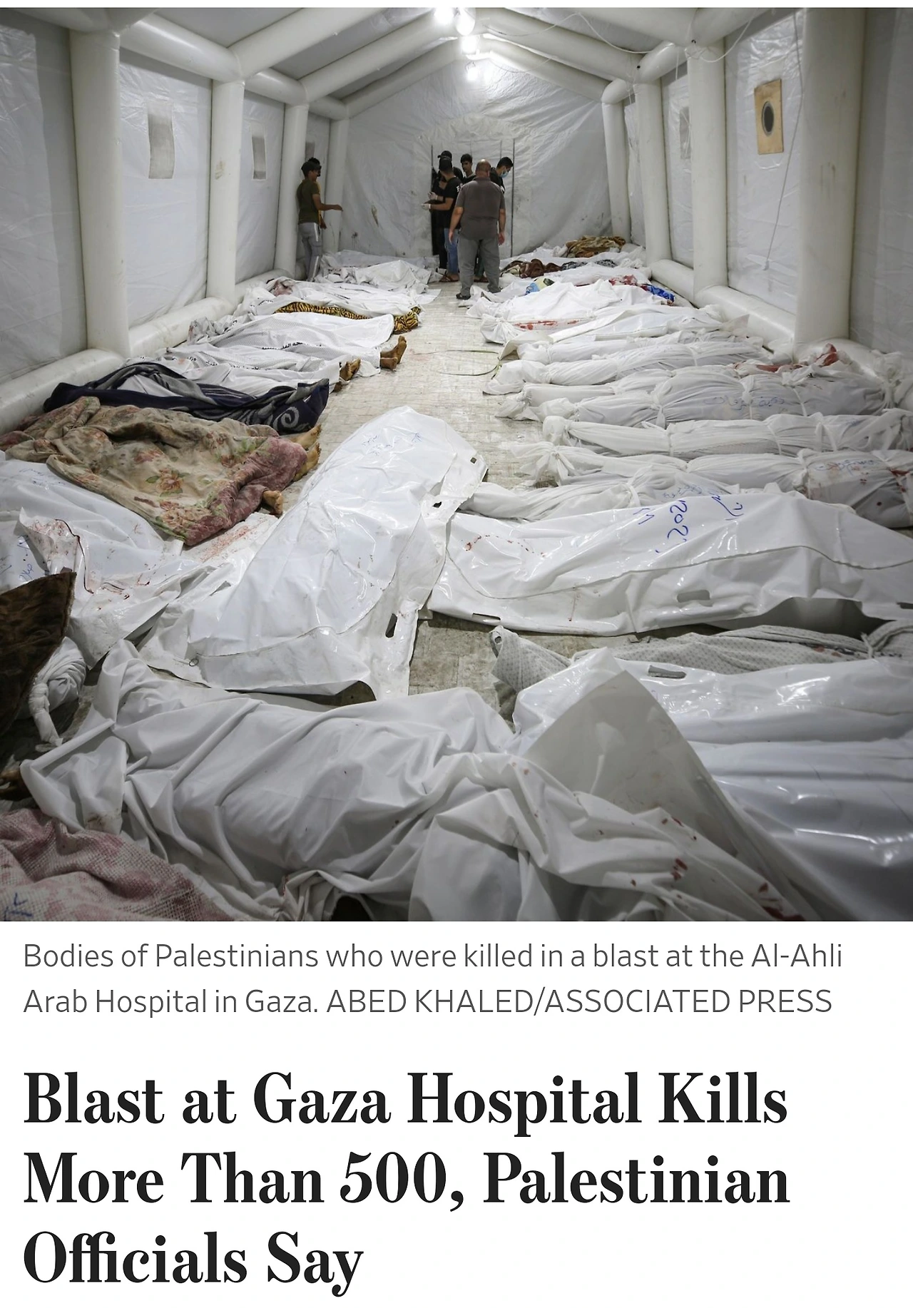17일(현지시간) 가자지구에 위치한 알 알리 아랍 병원에 무차별적인 공습으로 인해 500여 명이 넘는 무고한 민간인이 사망했다.