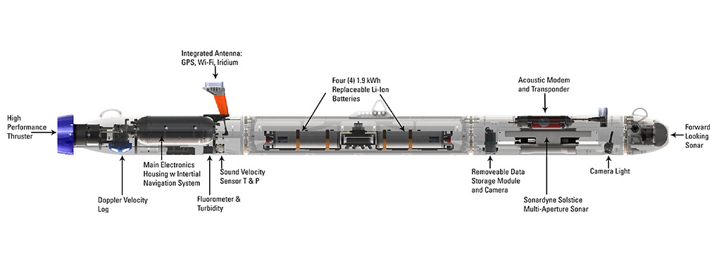 주요 구성품은 각 종 소나, 리튬이온 전지, 통합 안테나(GPS, Wi-Fi, Iridium), 온도/음속 측정기, 도플러 로그, 카메라, 저장장치(1TB) 등이 장착되어 있다.