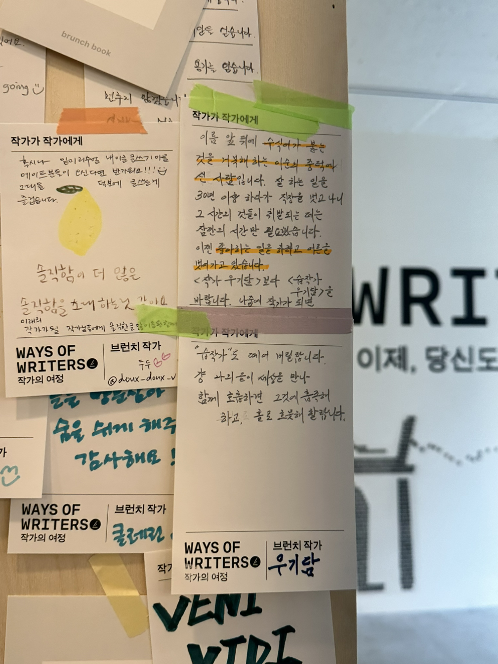 작가들의 이야기를 듣는 것도, 어떻게 작가가 되었는지도 그리고 글쓰기에 대한 글귀들도 좋았다.